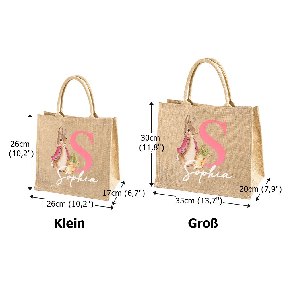 Diese Tragetasche zeigt ein charmantes Peter Hase-Design, das die Essenz dieser geliebten Figur einfängt. Der Hase ist aufwendig auf ein hochwertiges Jutematerial gedruckt, was der Tasche ein rustikales und natürliches Gefühl verleiht. Die Liebe zum Detail im Design erweckt Peter Hase zum Leben und macht diese Tasche zu einem echten Highlight unter den Osteraccessoires.