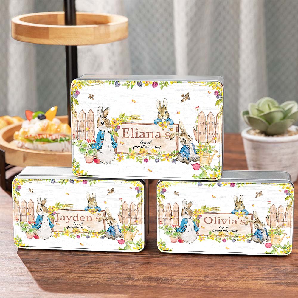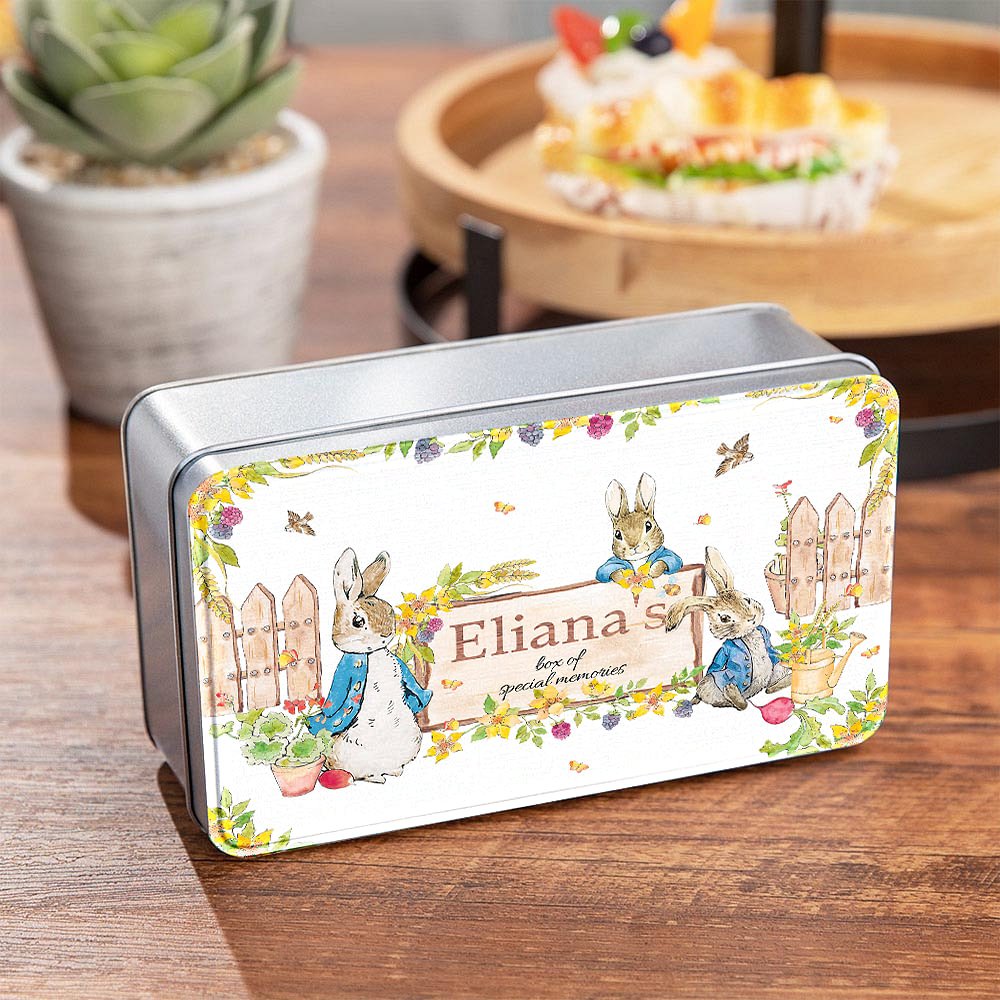 This biscuit tin showcases 3 adorable peter rabbit designs, complemented by enchanting floral motifs, adding a touch of loveliness. What's more, you have the option to personalize the name and text, making it truly special.