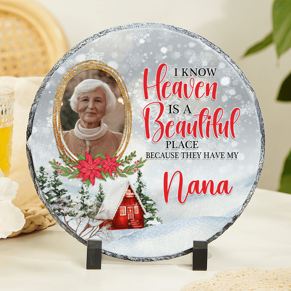 Dieser Gartenstein kann mit einem Foto und einem persönlichen Titel versehen werden. Die rührenden Worte "Ich weiß, dass der Himmel schön ist, denn dort gibt es mein [ ]" ergänzen die bezaubernde Szene eines roten Häuschens inmitten von Tannenzweigen und Schneeflocken. Bewahren Sie Ihre wertvollen Erinnerungen in einer dauerhaften, greifbaren Form.