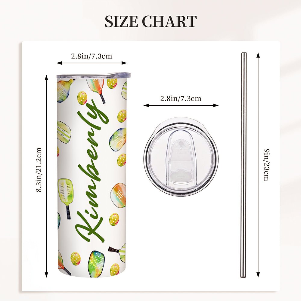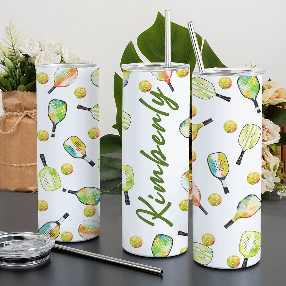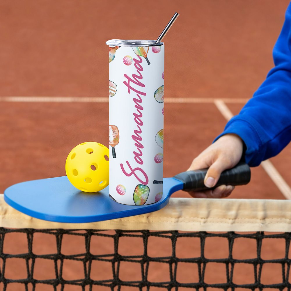 Dieser Becher hat ein lebhaftes und farbenfrohes Pickleball-Design, und Sie können den Namen darauf anpassen, was ihn zu einem einzigartigen und personalisierten Geschenk für jeden Pickleball-Enthusiasten macht.