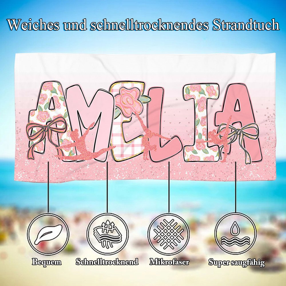 Dieses bezaubernde Strandtuch zeigt eine bezaubernde rosafarbene Silhouette einer Tänzerin mit Schleife. Das lebendige Design fängt den sonnigen Spaß ein, ein Favorit für Mädchen. Personalisieren Sie es mit Ihrem Namen, der kunstvoll in die Tanzsilhouette, die Rosen und die Schleife eingewebt ist, um ein einzigartiges, sentimentales Andenken zu schaffen.