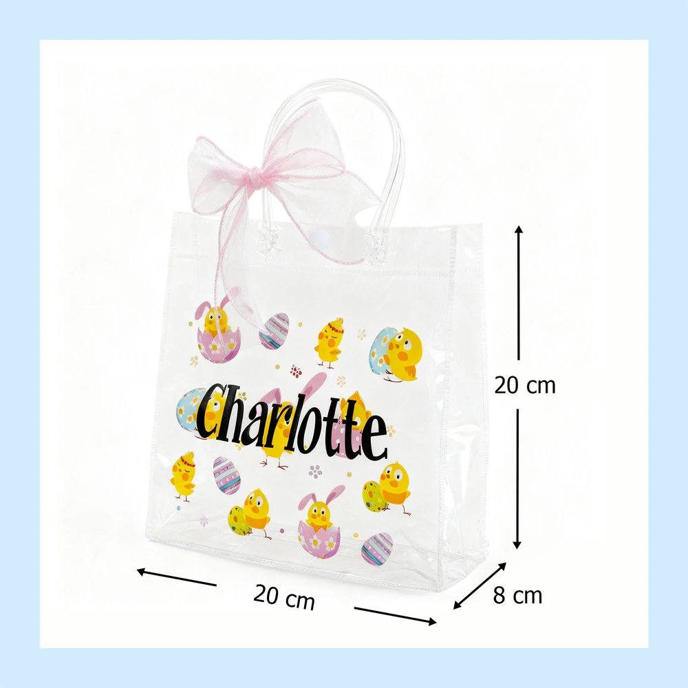 Mit niedlichen Osterelementen wie Eiern und Küken und einem zarten rosa Schleifenband verleiht diese durchsichtige Geschenktüte Ihren Festtagen einen festlichen und süßen Touch. Die Personalisierung macht jede Tüte einzigartig und unvergesslich.
