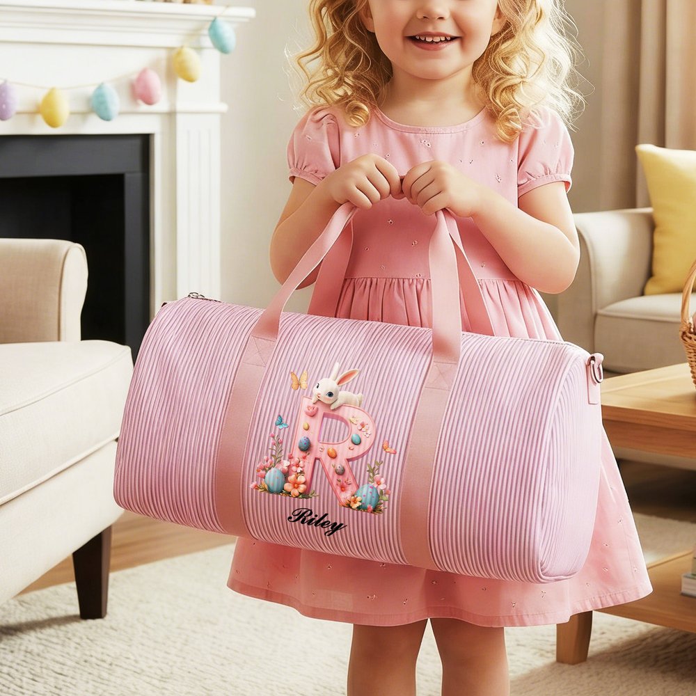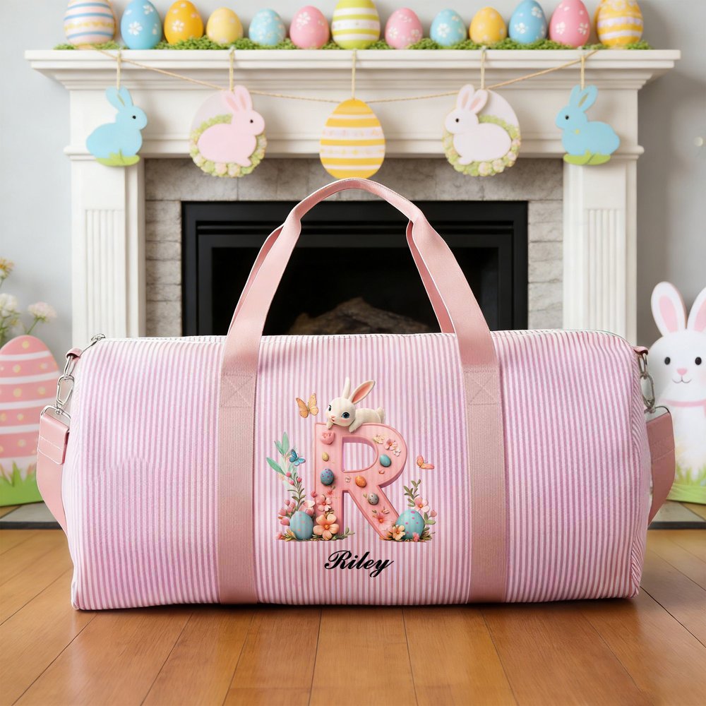 Auf dem gestreiften Canvasboden ist ein 3D-Buchstabe mit einem Osterhasen, bunten Eiern und Blumen sowie dem Namen des Kindes abgebildet. Der passende Bandhenkel sorgt für den letzten Schliff und verbindet Osterfreude mit persönlichem Charme zu einer Tasche, die sowohl funktional als auch voller festlicher Stimmung ist.
