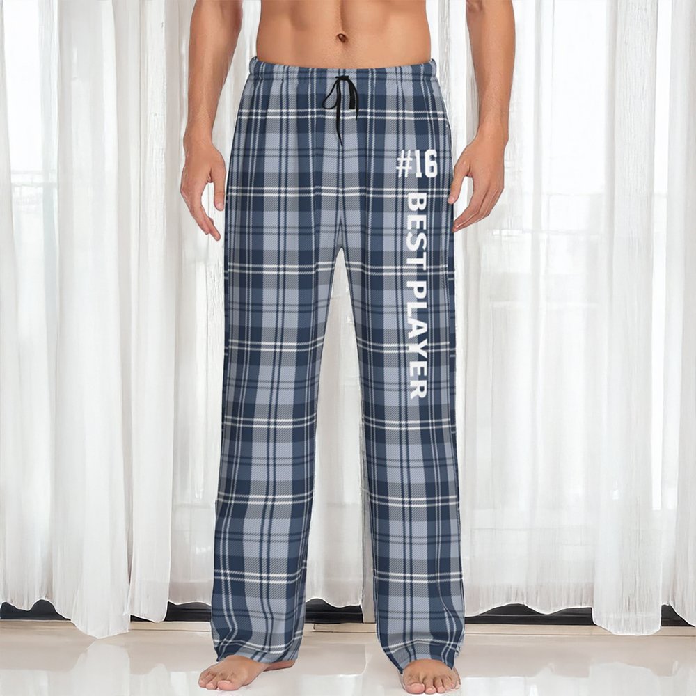 Diese Hose hat ein blau-schwarzes Karomuster, kombiniert mit individuell gestaltbaren Sportnummern und Namen. Das klassische Design macht diese Hose lässig und vielseitig.