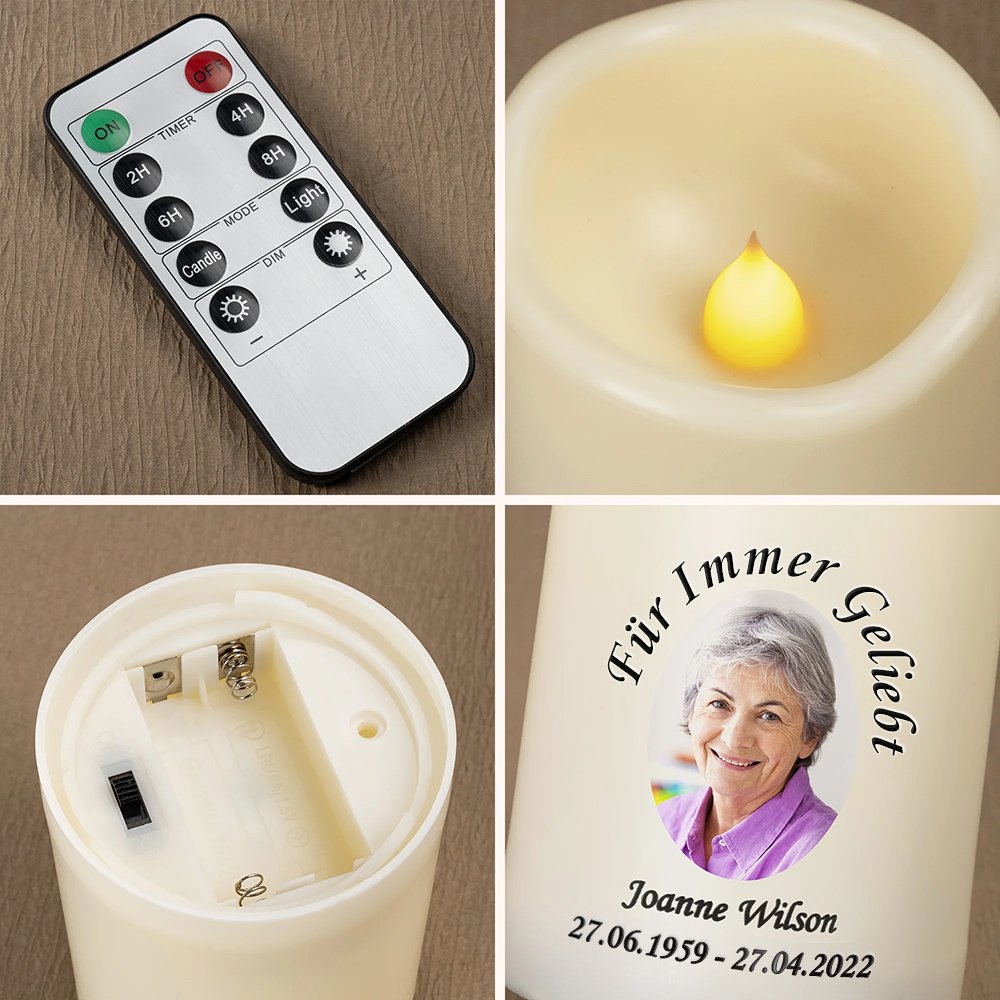 Das Foto, der Name und das Datum des verstorbenen Liebhabers können auf dieser Kerze individuell gestaltet werden, sodass diese Kerze eine ganz persönliche Bedeutung für das Gedenken hat. „Diejenigen, die unser Leben berühren, bleiben für immer in unseren Herzen“ ist auf der Rückseite der Kerze gedruckt, um die Erinnerung an den Verstorbenen auszudrücken. Das Aussehen der Kerze unterscheidet sich nicht von dem einer echten Kerze, aber es ist eine flammenlose LED-Kerze, die nicht nur sicher und umweltfreundlich ist, sondern auch diese wertvolle Erinnerung für immer bewahren kann.