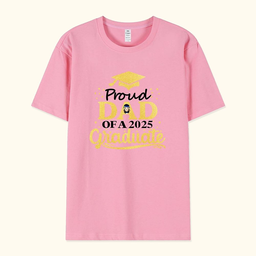 Es hat ein goldenes Glitzerdesign, das stolz den Text "Proud Mom of A 2025 Graduate" zeigt. Mit anpassbaren Optionen für Farbe und Größe des T-Shirts sowie der Möglichkeit, ein Foto des Absolventen hochzuladen, wird dieses T-Shirt zu einem persönlichen Erinnerungsstück.
