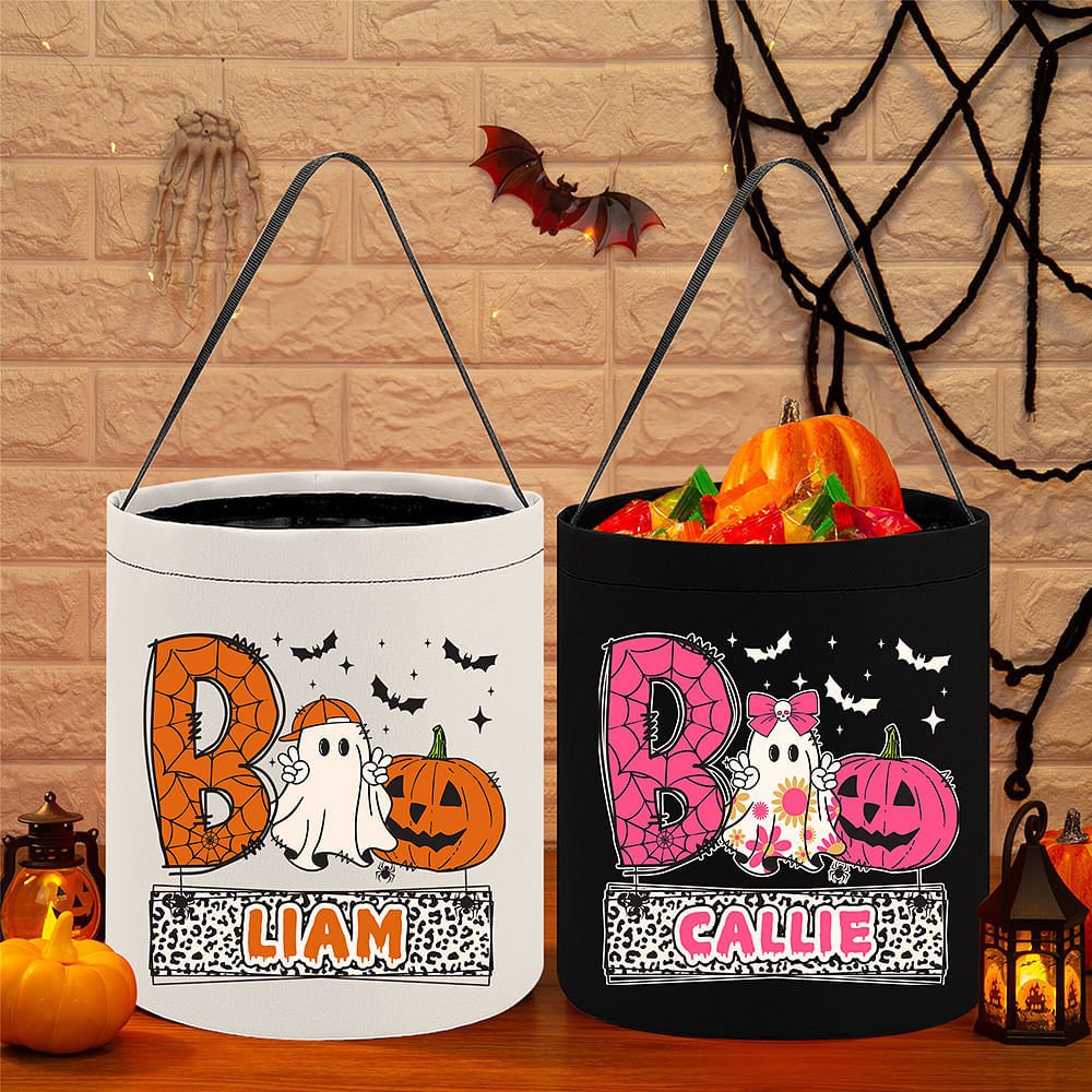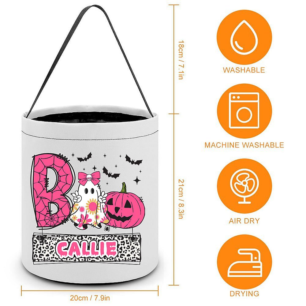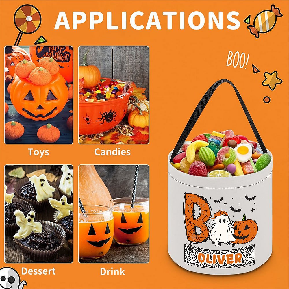 Dieser Süßigkeitenkorb mit lustigen Kürbissen, Geistern, Spinnen und Fledermäusen kann mit Namen versehen werden und ist ein besonderes Halloween-Geschenk für Ihre Kinder. Dieser Korb eignet sich perfekt zum Sammeln von Halloween-Süßigkeiten und verleiht dem Süßes-oder-Saures-Erlebnis eines Kindes eine persönliche Note, die den festlichen Spaß noch verstärkt.