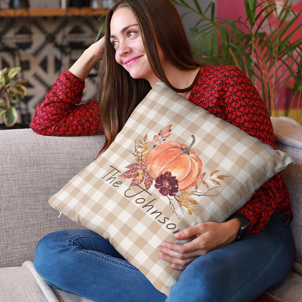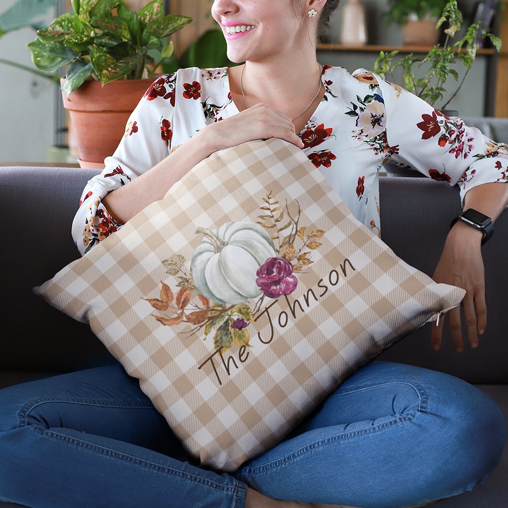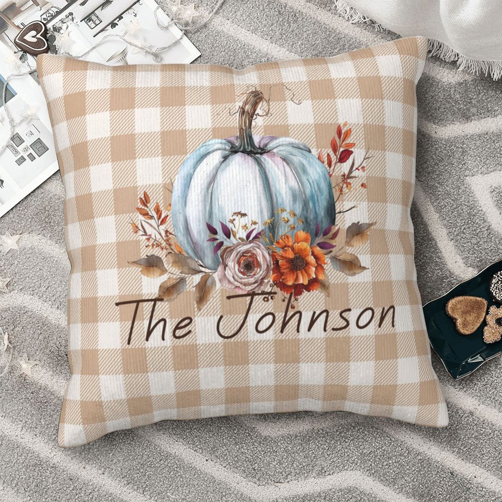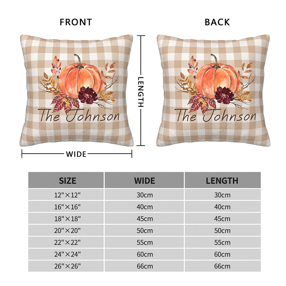 Dieser personalisierte Kissenbezug kann in verschiedenen Umgebungen verwendet werden, z. B. in Wohn- und Schlafzimmern oder im Freien. Das vom Herbst inspirierte Kürbisdesign eignet sich für saisonale oder ganzjährige Dekorationen.