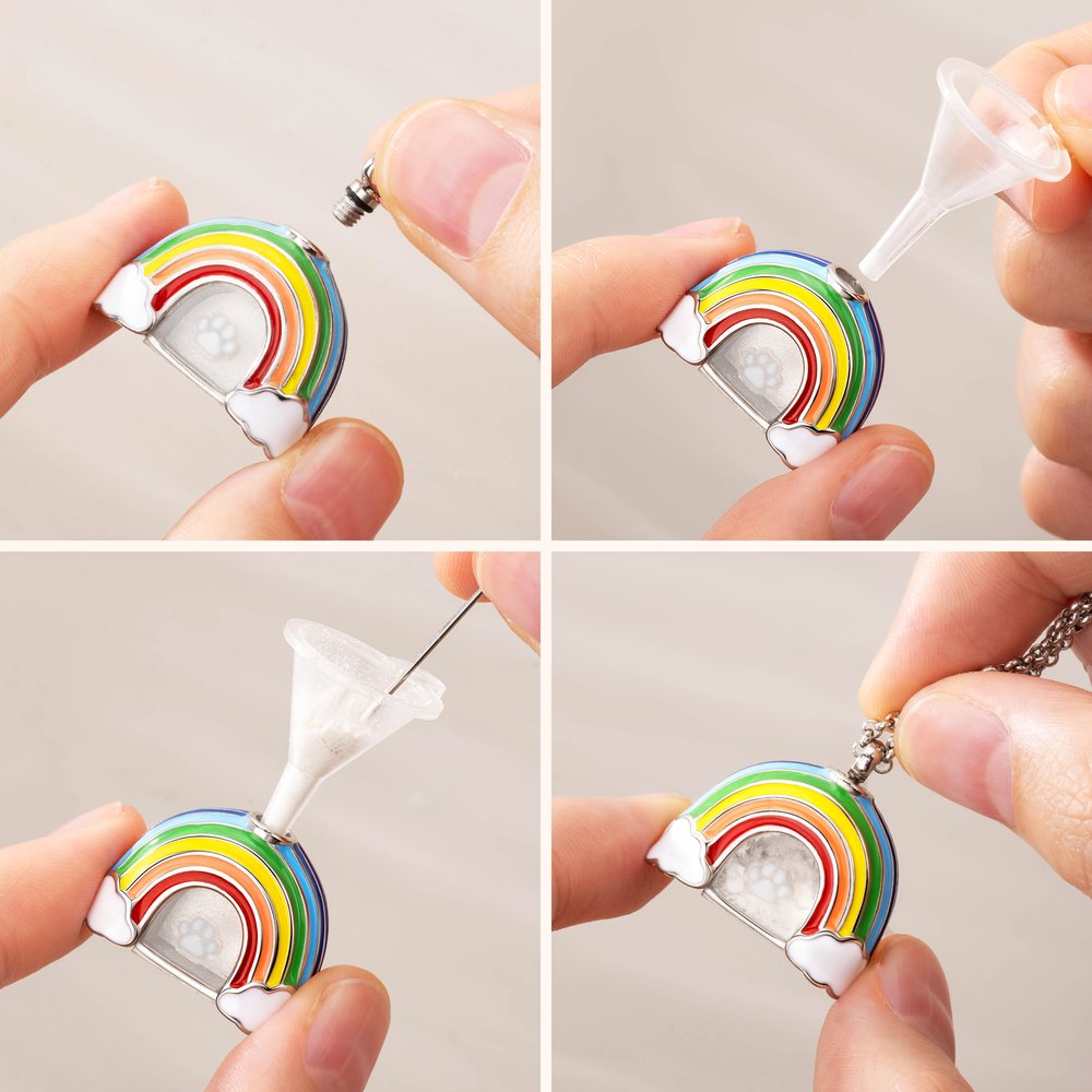 Der Verlust eines Haustieres kann einem das Herz brechen. Diese Gedenkkette für Haustiere enthält eine hohle Urne, in der die Asche oder das Fell deines Haustieres aufbewahrt werden kann. Die Regenbogenbrücke und der Fußabdruck auf der Vorderseite erinnern an deinen pelzigen Freund und lassen dich wissen, dass der Himmel einen weiteren Engel gewonnen hat.