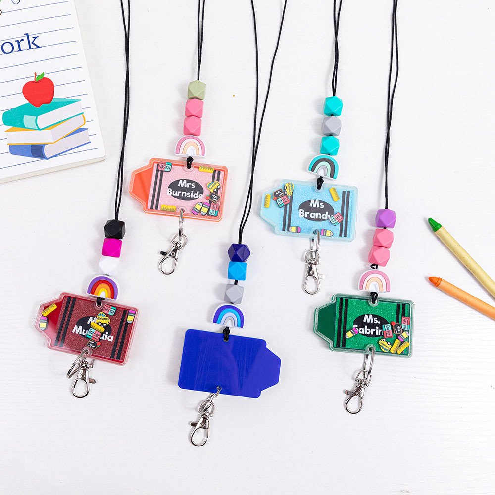Diese personalisierte Buntstifte Shaker Schlüsselband hat kleine bunte Bildung Element Elemente wie ein Lineal, Radiergummi, etc., Springen im Inneren, einen Hauch von hellen Farbe des Lehrers Lehrerkarriere hinzuzufügen. Sie können den Namen des Lehrers anpassen und wählen Sie vier Perlen, um das Schlüsselband zu schmücken, um das Geschenk mehr einzigartig zu machen.