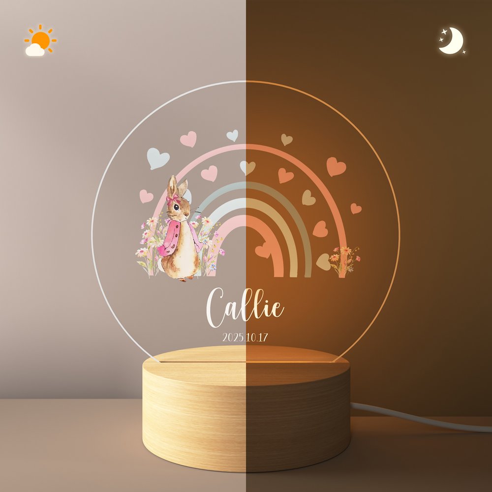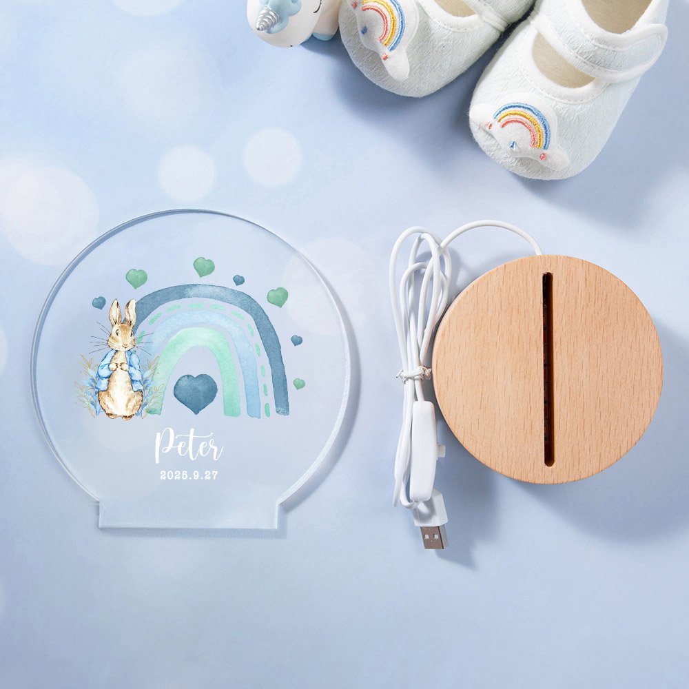 Dieses LED-Nachtlicht ist mit "Märchenmond", "Regenbogenblumen" und dem klassischen Peter Rabbit-Motiv als Designthema gestaltet und kombiniert Fantasie-Märchenelemente mit warmem Licht, um eine verträumte und friedliche Atmosphäre zu schaffen. Der Lampenkörper kann mit Namen und Daten individuell gestaltet werden, was dem Kinderzimmer einen exklusiven, persönlichen Charme verleiht.