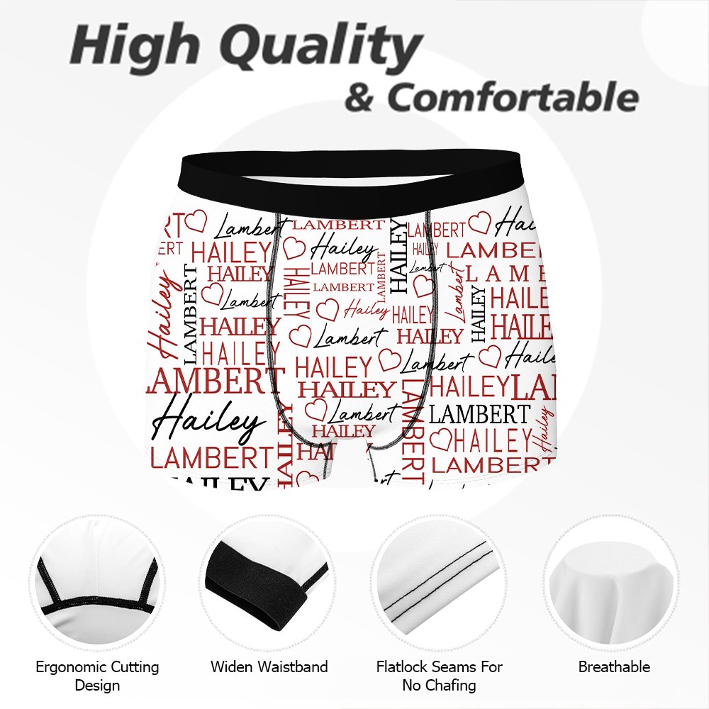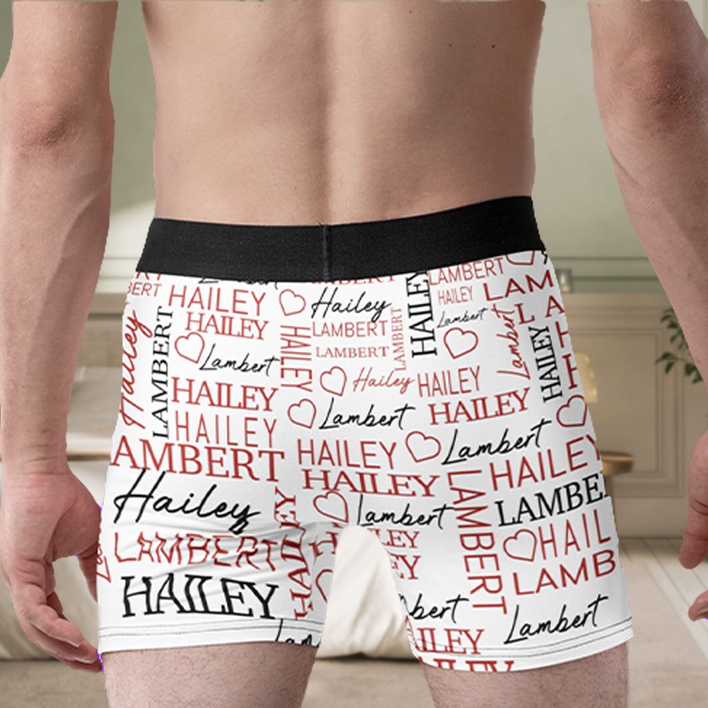 Diese Unterwäsche wurde speziell für Paare entworfen und zeichnet sich durch ein stilvolles und süßes, sich wiederholendes Namensmuster im Stoff aus. Du kannst die Namen und ihre Farben individuell gestalten, was die einzigartige Verbindung und Harmonie zwischen den Partnern symbolisiert und dieses Geschenk wirklich persönlich und einzigartig macht.