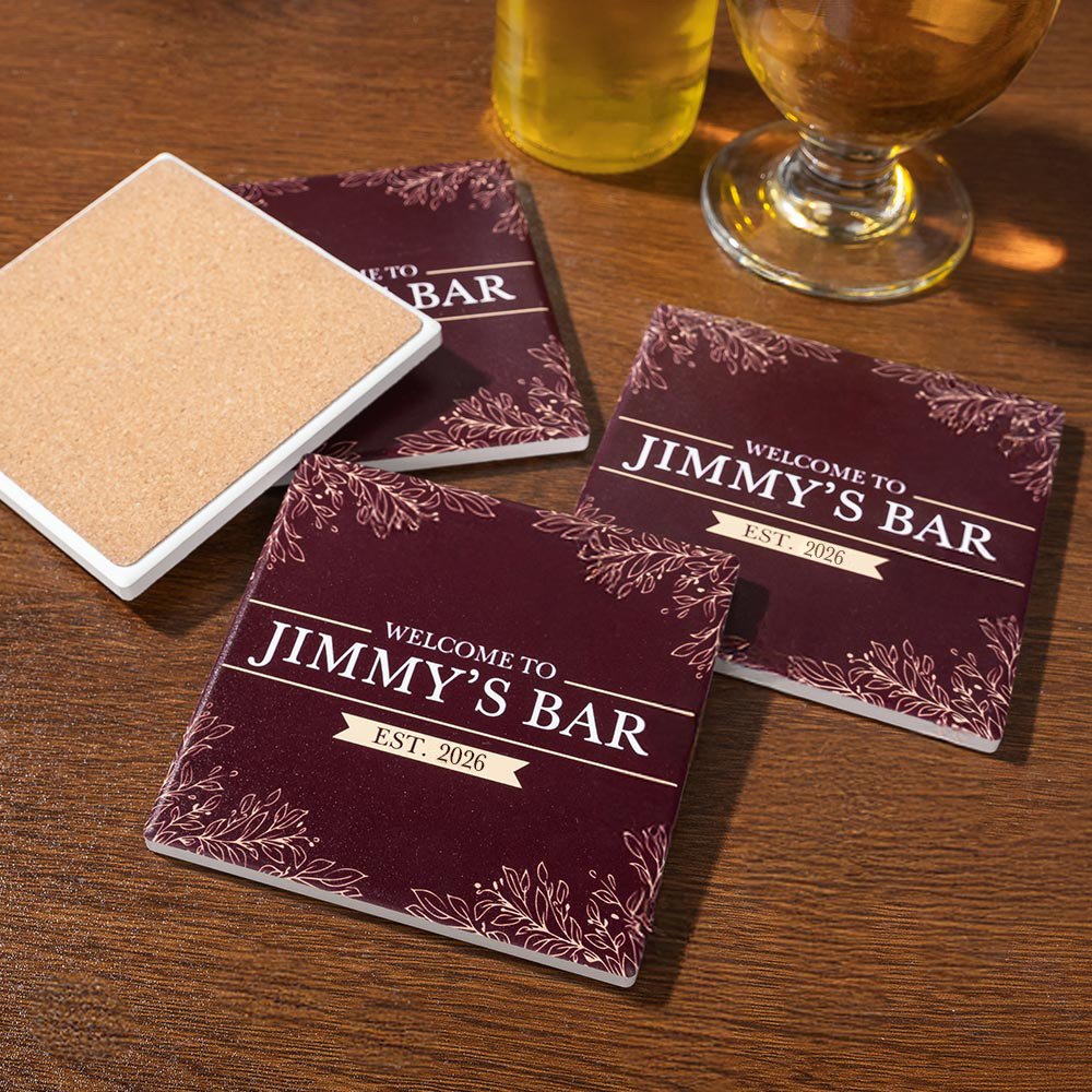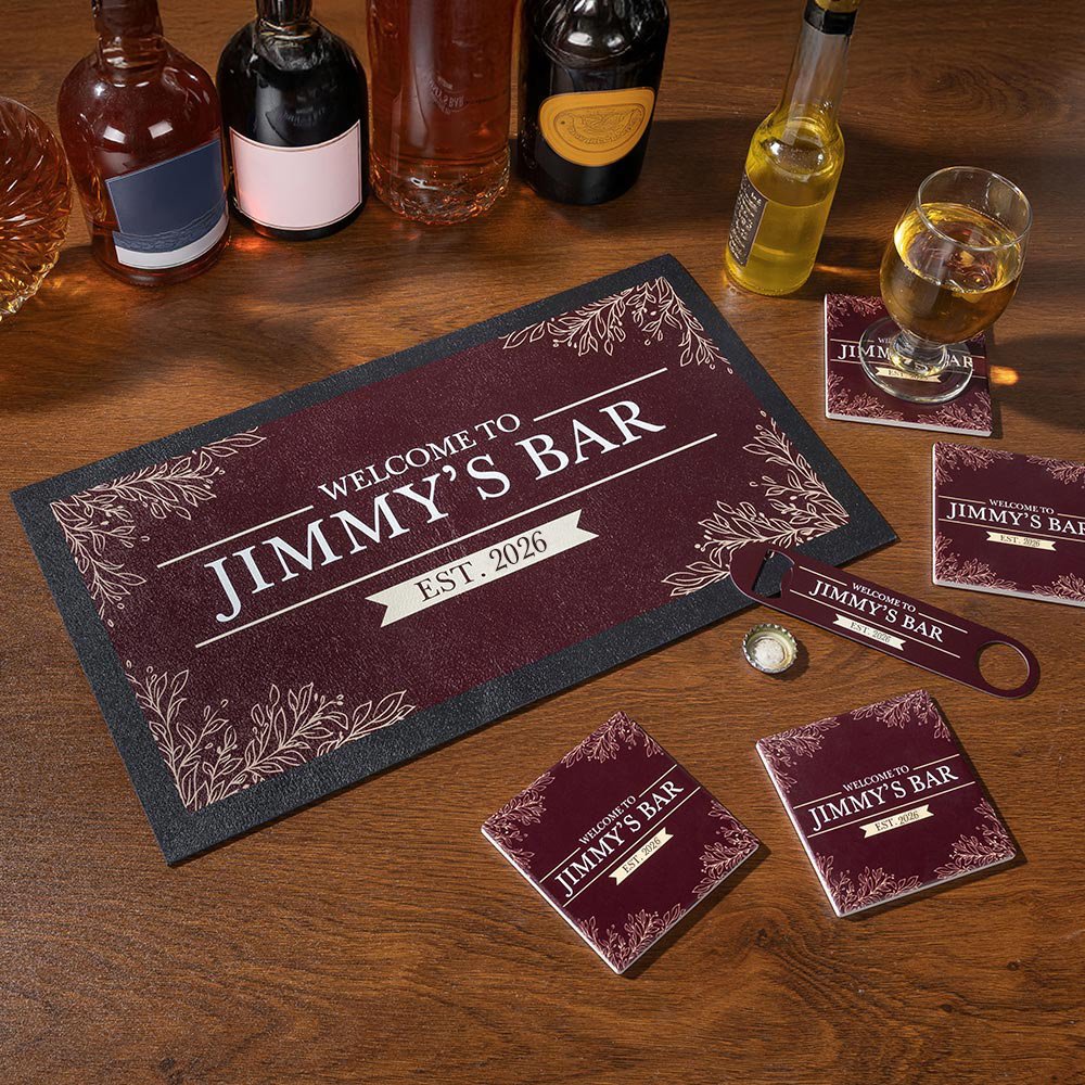 Dieses komplette Set aus Barmatten, Untersetzern und Flaschenöffnern ist mit einem schönen und schlichten Blattmuster versehen, das Praktikabilität und Stil vereint. Erhältlich in 5 Retro-Farben, können Sie das Set passend zu Ihrem Einrichtungsstil kaufen und es mit Ihrem Namen und der Jahreszahl versehen, um eine persönliche Dekoration für Ihr Zuhause oder Ihre Bar zu schaffen.