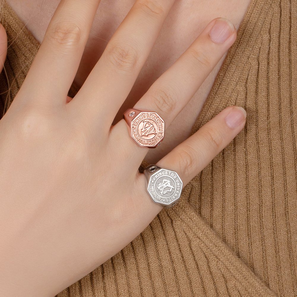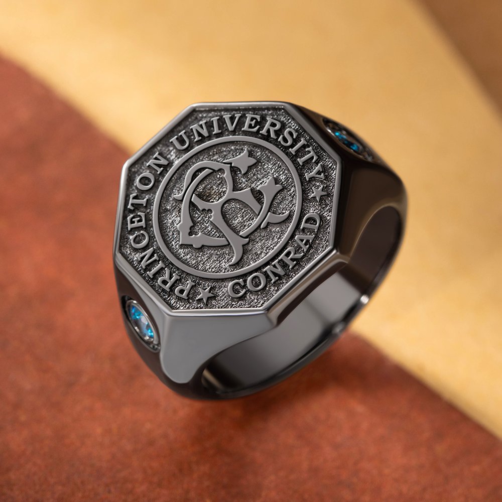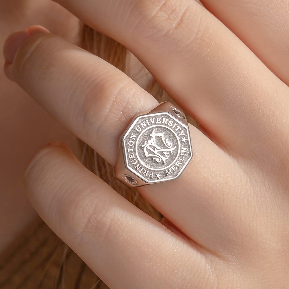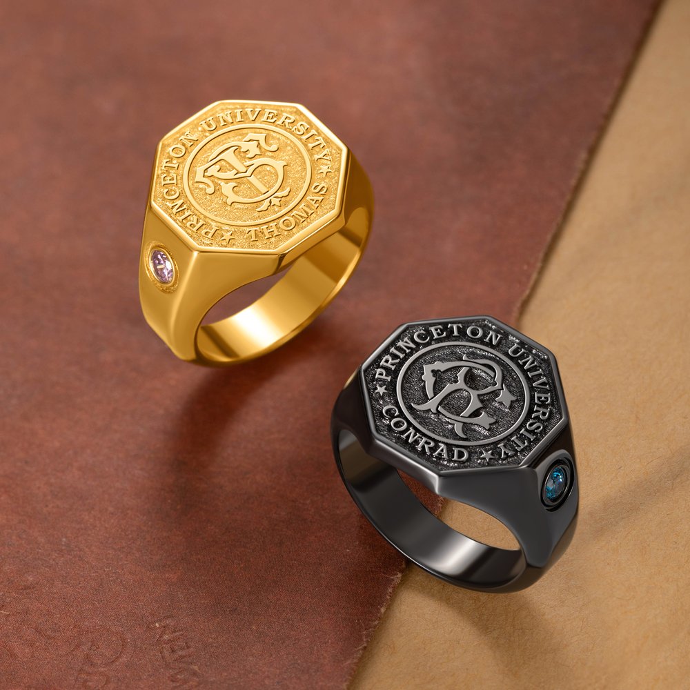 Mit Geburtssteinen auf beiden Seiten, die den Geburtstagsmonat repräsentieren, trägt dieser Ring herzliche Segnungen und Hoffnungen in sich. In der Mitte befindet sich ein retro-inspiriertes Monogramm, das elegant von dem Namen der Schule und dem individuellen Namen umgeben ist und Leistung und Stolz symbolisiert. Mit seinem zeitlosen Design wird jeder Ring zu einem geschätzten Andenken, das mit einzigartigen Erinnerungen gefüllt ist.