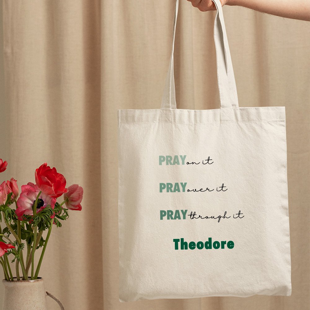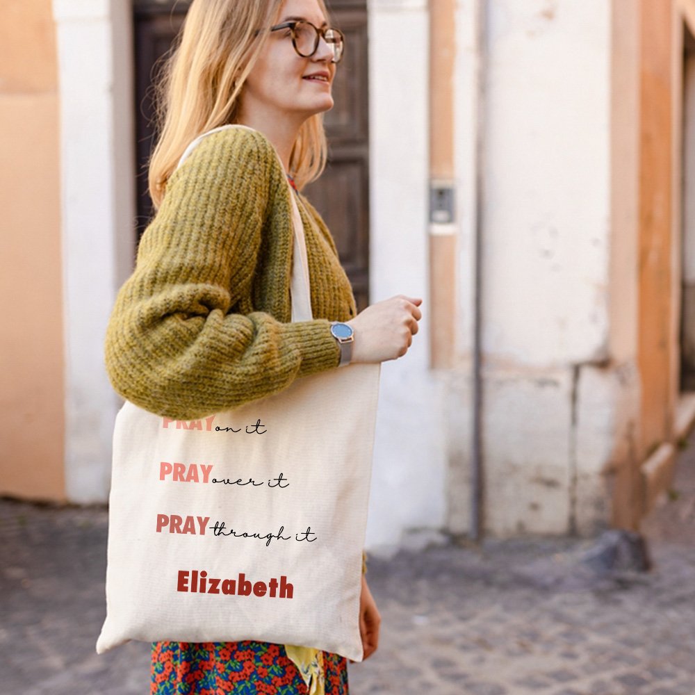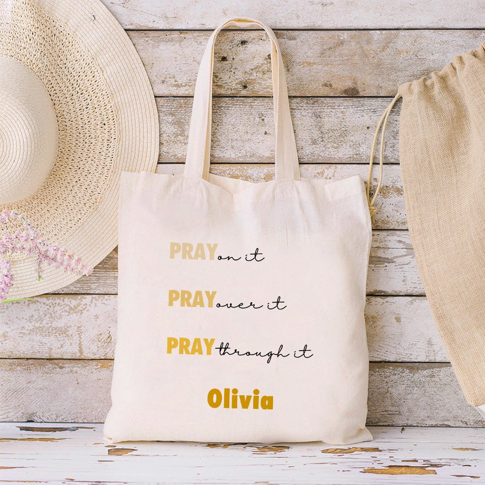 Tragen Sie Ihren Glauben mit unserer personalisierten Segeltuchtasche "Pray On It" bei sich. Diese wunderschön gestaltete Tasche dient als tägliche Erinnerung an die Kraft des Gebets und ist ein sinnvolles Geschenk für Freunde in Ihrer Bibelstudiengruppe oder für Sie selbst.