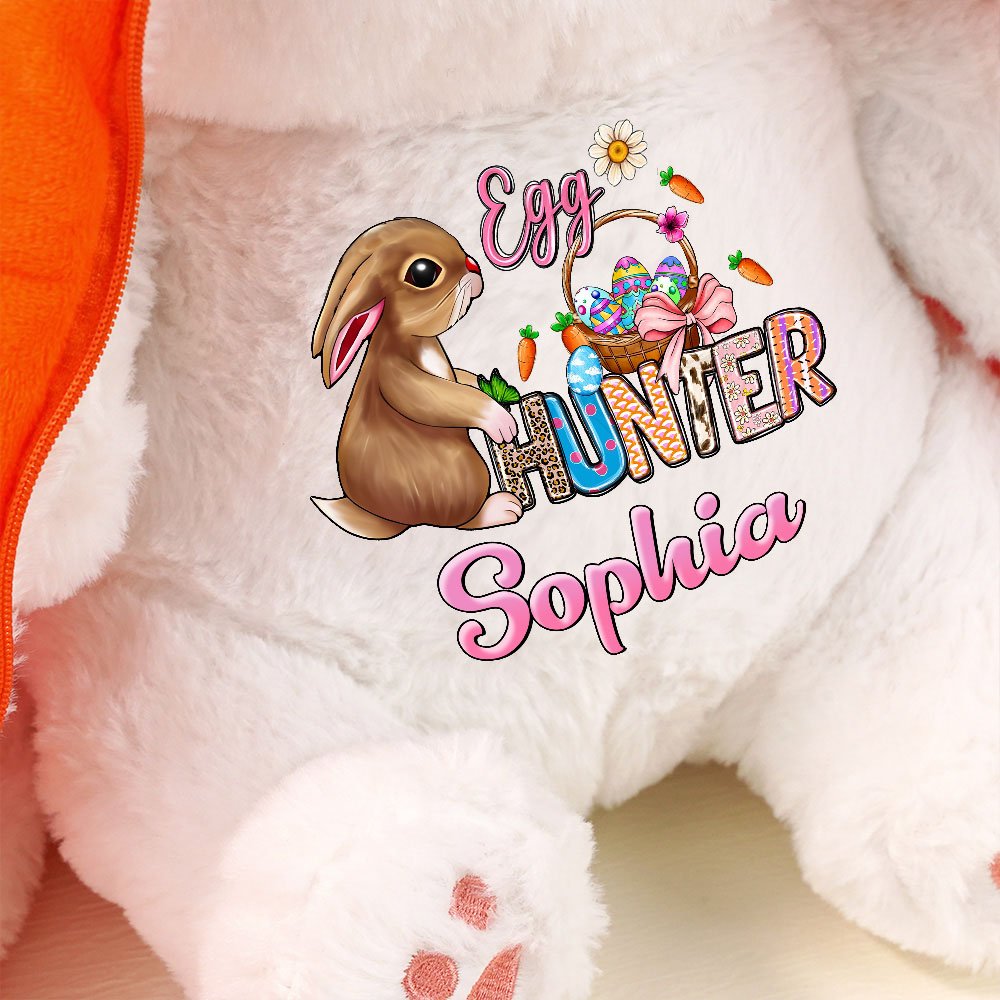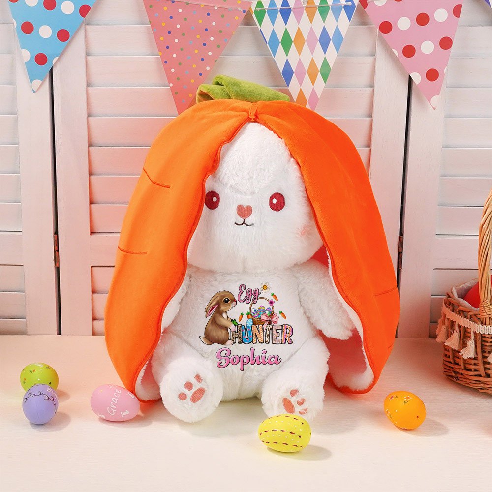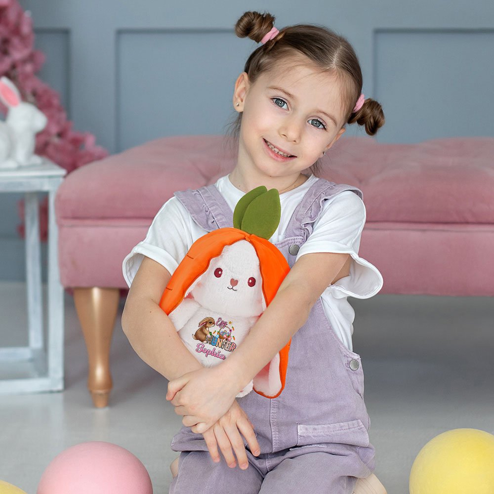 Dies ist ein faszinierendes Häschen-Spielzeug; die neuartige Karottenform hat einen Reißverschluss, der sich öffnet, um ein super süßes kleines Häschen mit großen Ohren zu enthüllen, was eine große Überraschung ist. Die Bauchlage des Hasen kann mit dem Namen des Kindes personalisiert werden. Niedliche Hasenmuster wie Camouflage-Häschen oder Ostereier-Häschen können ausgewählt werden, die eine Vielzahl von Namensfarben wie Gold, Leopard, Blumen, und so weiter haben. Das reichhaltige und personalisierte Design kann den einzigartigen Charakter eines jeden Kindes zum Ausdruck bringen.