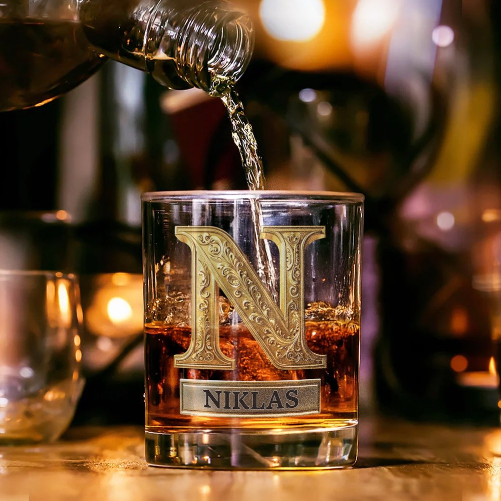 Dieses Whiskeyglas besticht durch zwei elegante Designs mit Buchstaben: ein barockes Retro-Muster in Gold sowie eine viktorianische Variante in Roségold, verziert mit filigranen Rosen und funkelnden Diamantakzenten. Verleihen Sie dem Glas eine persönliche Note, indem Sie es mit einem individuellen Namen gravieren lassen – so entsteht ein besonderes Stück, das sowohl Stil als auch Emotionen auf besondere Weise zum Ausdruck bringt.
