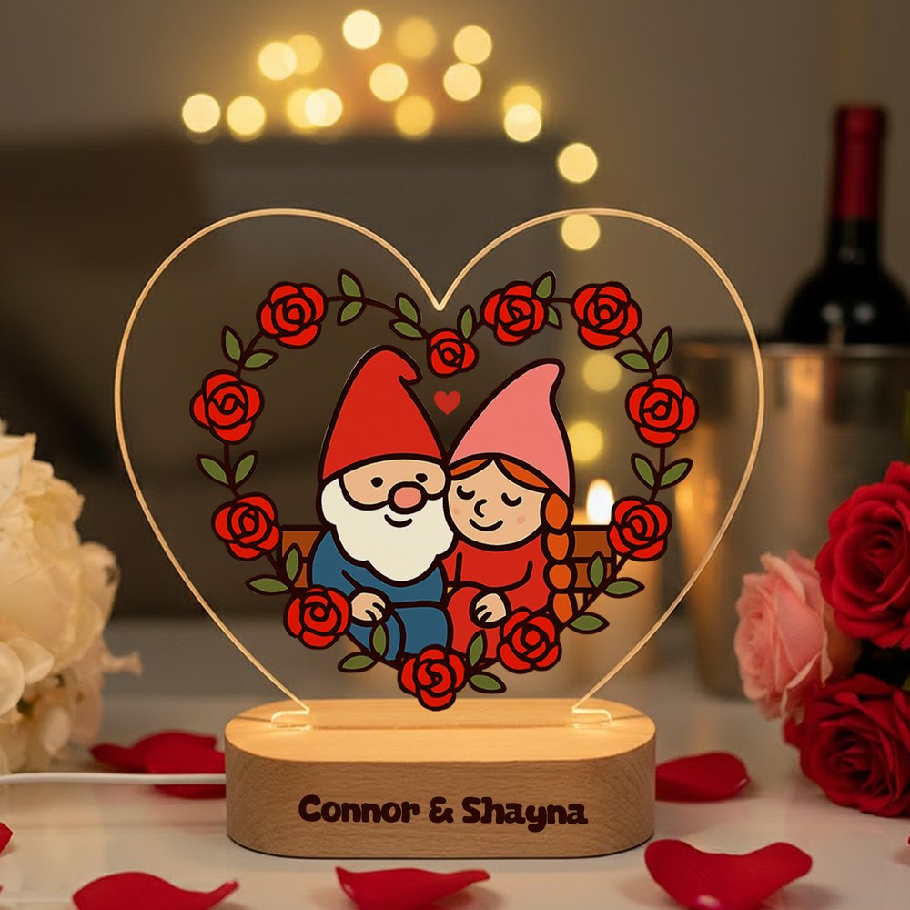 Dieses herzförmige Acryl-Nachtlicht zeigt romantische Rosen und bezaubernde Zwergenpaare, die ein Symbol der Zweisamkeit darstellen. Sie können es mit einem individuellen Namen versehen und so Ihre gemeinsame Geschichte und Zuneigung auf einzigartige Weise zum Ausdruck bringen.