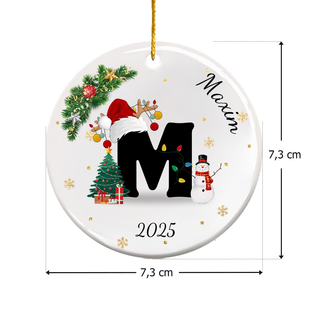 Sie können zwischen zwei Formen und Seilfarben wählen. Wählen Sie eine Initiale von A bis Z, jeweils mit einem Buchstaben mit Weihnachtsmannmütze, einem Schneemann und einem Weihnachtsbaum. Fügen Sie einen individuellen Namen und eine Jahreszahl hinzu, um das Ornament in ein einzigartiges, persönliches Weihnachtserinnerungsstück zu verwandeln – perfekt, um der Weihnachtsdekoration eine persönliche Note zu verleihen und bleibende Erinnerungen zu schaffen.