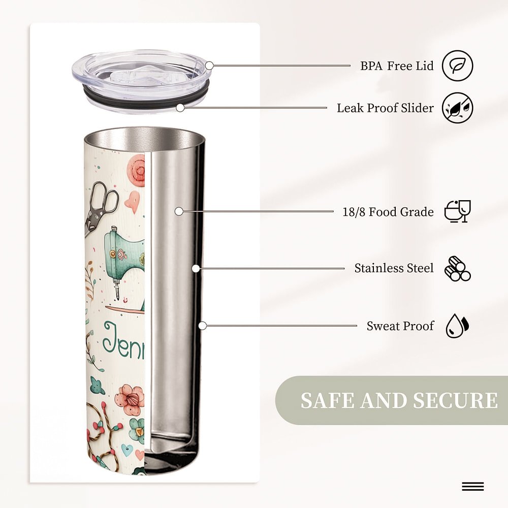 Mit der Möglichkeit, einen Namen einzutragen, hebt sich dieser dünne 20-Unzen-Becher als äußerst kreatives Geschenk ab. Die Personalisierung verleiht ihm eine intime und inspirierende Note, ähnlich wie das fantasievolle Flair eines Nähvirtuosen. Verschenken Sie diesen aufmunternden Becher als Erinnerung an die von ihnen geschaffenen Nahtschätze und zeigen Sie Ihre Wertschätzung für ihre handgefertigten Werke.