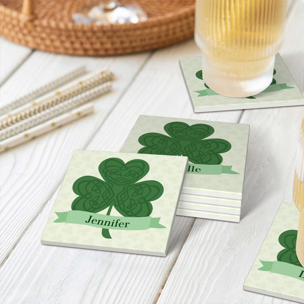 Personalisierte vierblättrige Kleeblatt Kleeblatt keltischen Knoten Untersetzer mit Namen Satz von 2 St. Patrick's Day Geschenk für Familie