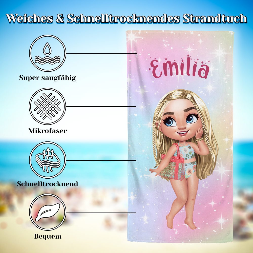 Dieses Strandtuch hat einen glitzernden Stern mit Farbverlauf als Hintergrund, der mit einem niedlichen und pfiffigen Mädchenmotiv versehen werden kann, wodurch ein visueller Effekt voller jugendlicher Vitalität entsteht. Sie können auch Ihren Namen angeben, damit jedes Strandtuch zu Ihrem exklusiven Stück wird.