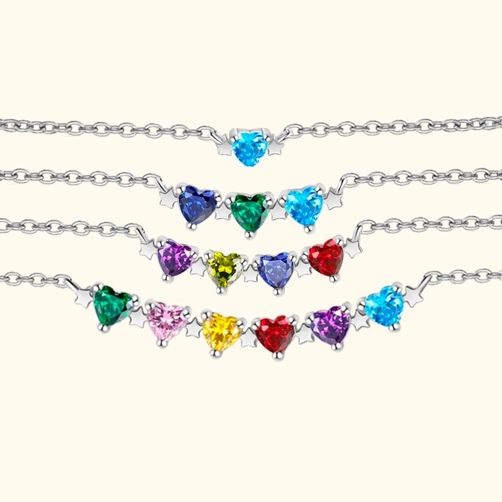 By carefully cutting the heart-shaped birthstone with stars, it is simple and elegant without losing the sense of fashion. 1-6 heart-shaped birthstones further enhance its charm, colored gemstones symbolize the company of family members, and stars interspersed with each other symbolizing love, warmth, and individuality.