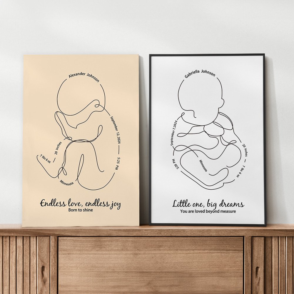 Sie können aus 9 niedlichen Babymustern wählen, die alle voller kindlicher Freude und Wärme sind. Was noch erfreulicher ist, ist, dass Sie den Namen, den Geburtstag, die Größe, das Gewicht, die Geburtszeit, den Geburtsort und Ihren Segnungstext für Ihr Baby personalisieren können, was dieses Geschenk noch einzigartiger und voller exklusiver Liebe macht.