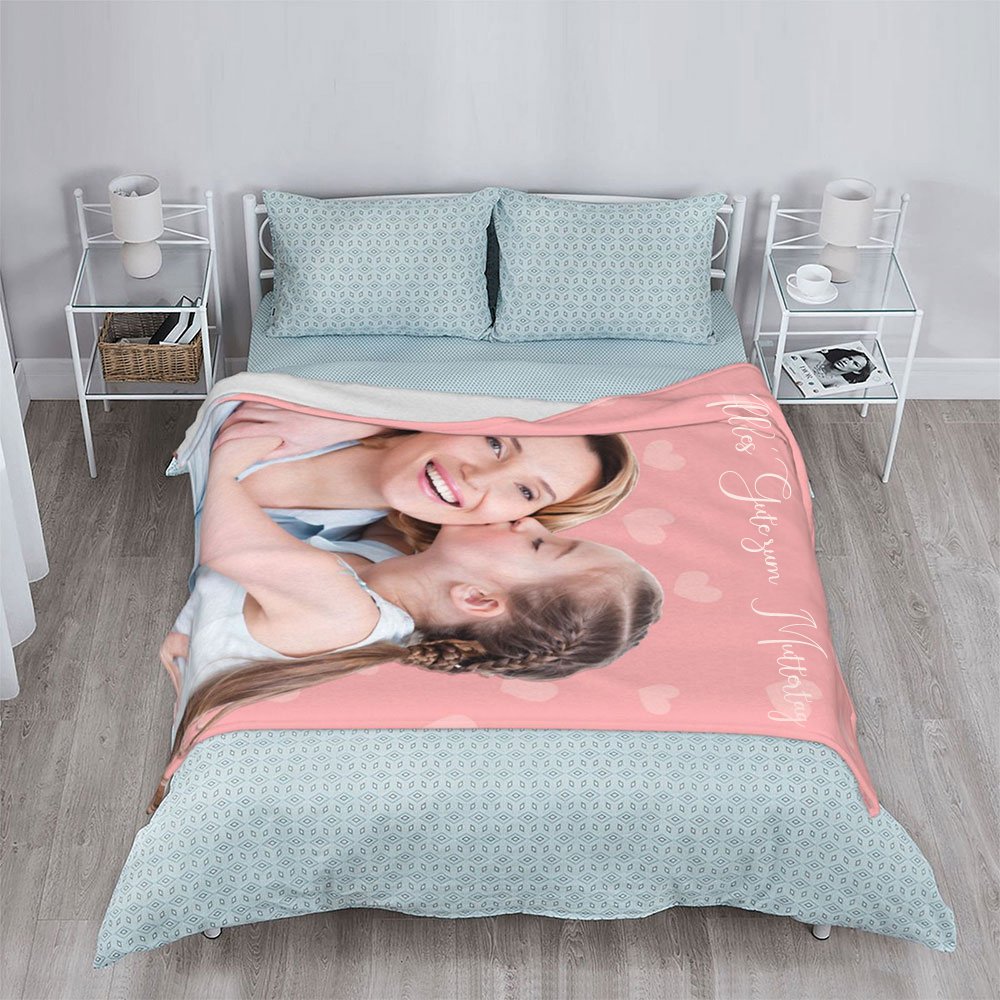 Diese Decke können Sie mit einem Foto und einem Text individuell gestalten und so Ihre kostbaren und intimen Momente mit Ihrer Mutter oder einem Familienmitglied festhalten.