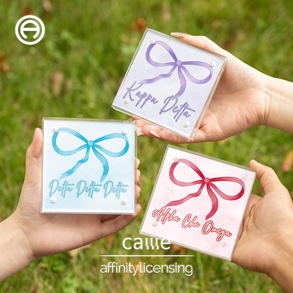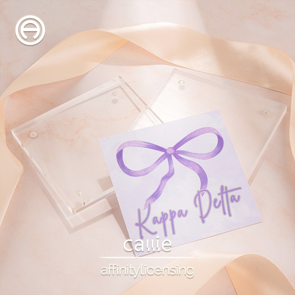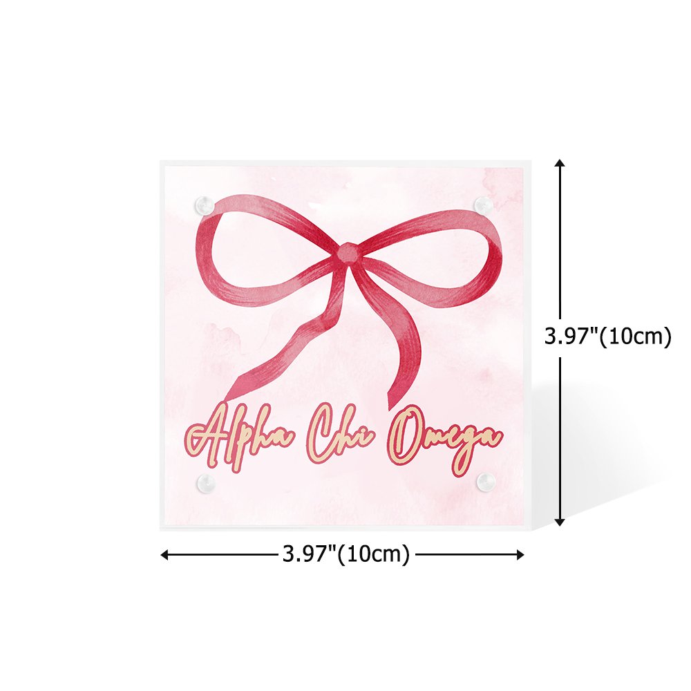 Dieser Acrylblock mit der stilvollen koketten Schleife ist niedlich und elegant zugleich. Die Schleife symbolisiert Einigkeit und Schwesternschaft. Es ist ein perfektes Dekorationsstück für jedes Mitglied einer Schwesternschaft, das seinen Stolz zeigen möchte.