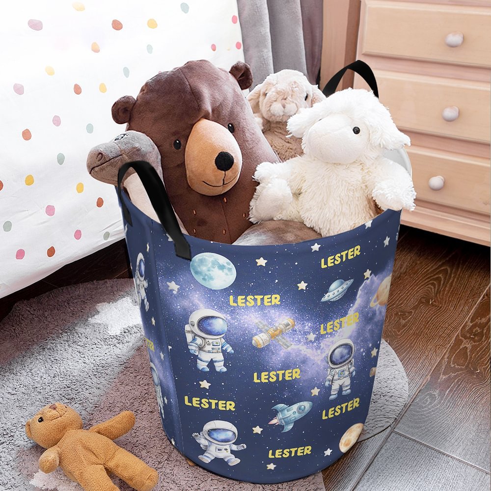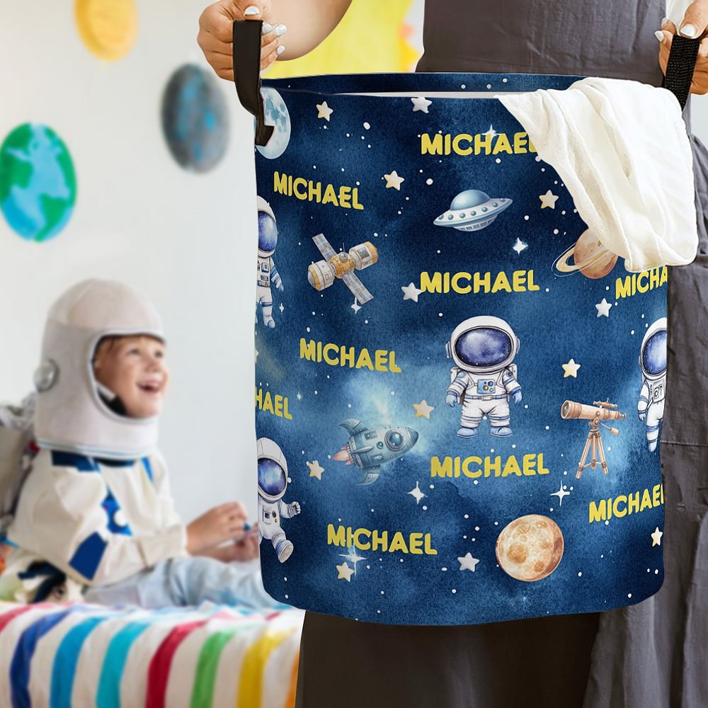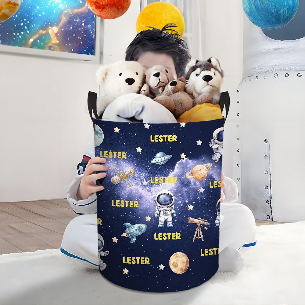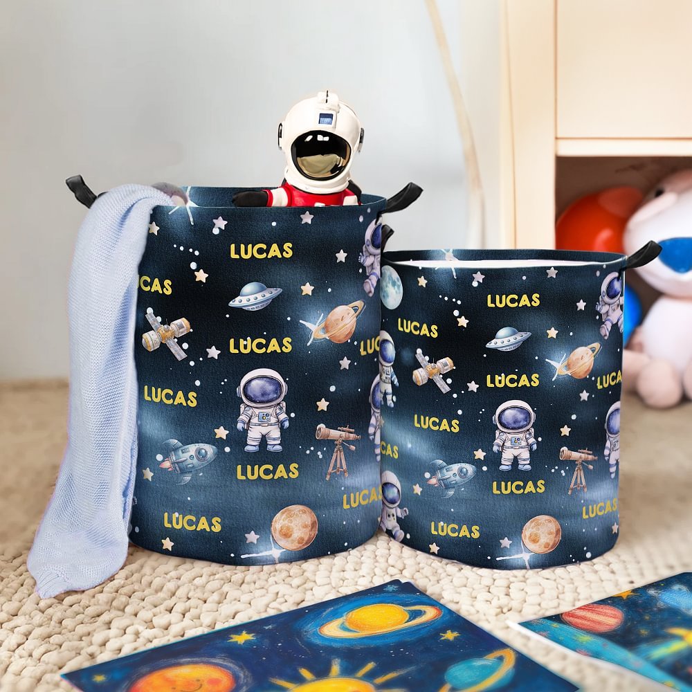 Der Hintergrund dieses Aufbewahrungskorbs ist ein dunkelblauer Sternenhimmel, der mit Weltraummotiven wie Astronauten, Raketen und Planeten verziert ist. Er kann auch mit einem Namen versehen werden und verbindet so die Weltraumatmosphäre mit persönlichen Merkmalen.