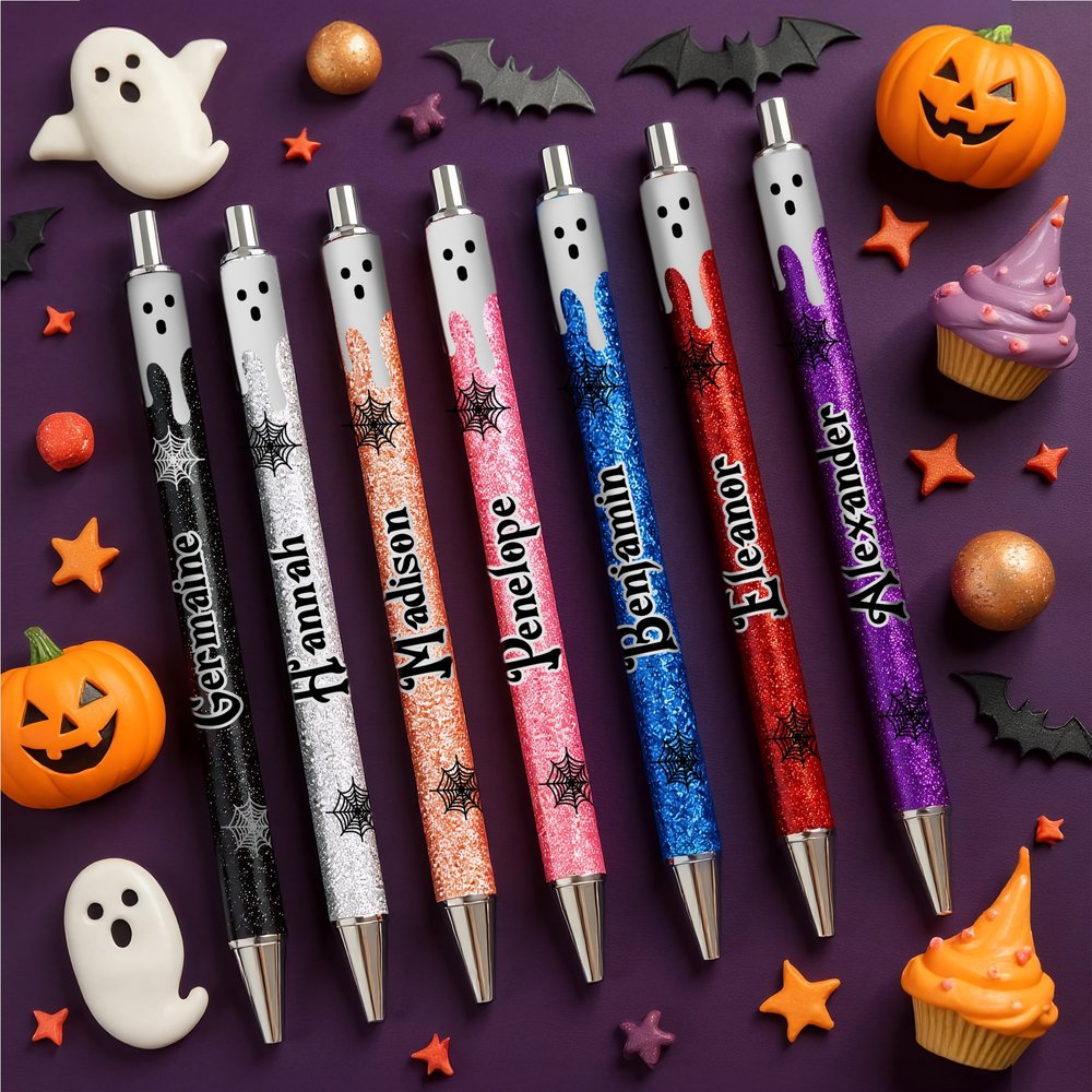 Unser Kugelschreiber besticht durch sein leuchtendes, schimmerndes Farbschema, das in 10 Farben erhältlich ist, und ist ein echter Blickfang. Das Design strahlt ein festliches Gefühl von Geheimnis und Spaß aus, mit geisterhaften Elementen und Spinnennetzmotiven, mit einem markanten Namen in der Mitte zur individuellen Gestaltung, um ein Schreibgerät zu schaffen, das wirklich Ihnen gehört.