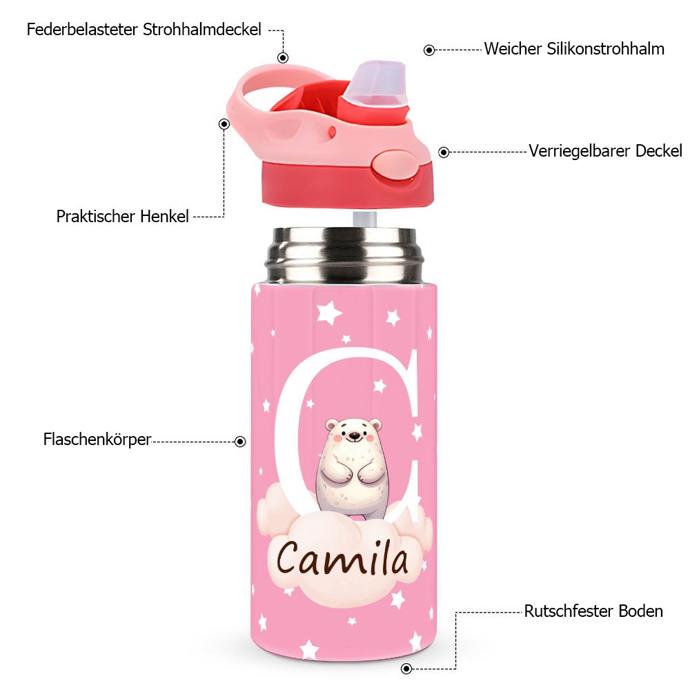 Diese Trinkflasche besteht aus lebensmittelechtem Edelstahl, der sicher, ungiftig, langlebig und rostfrei ist. Die Außenseite verwendet eine hochwertige, kratzfeste Lackoberfläche; das Muster verblasst nicht leicht und ist langlebig. Der Silikonstrohhalm ist weich und geruchlos, eignet sich ideal für den täglichen Gebrauch von Kindern und lässt sich leicht reinigen, um eine hygienische Nutzung zu gewährleisten.