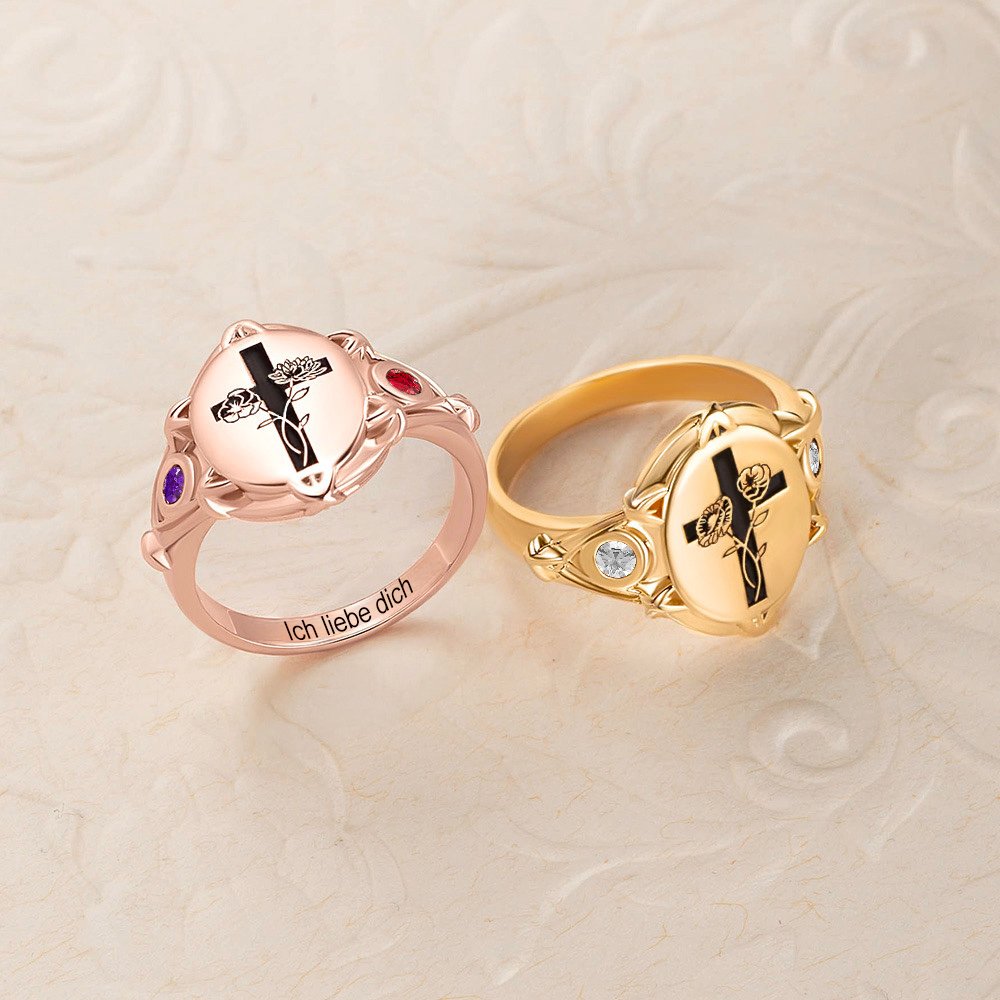 Dieser elegante Siegelring zeigt den Stern von Bethlehem, zwei ineinander verschlungene Geburtsblumen mit Kreuz und zwei Geburtssteinen, die eine tiefe Verbindung und Bindung zwischen zwei Menschen symbolisieren. Perfekt, um Familie, Freundschaft, Liebe oder Glauben zu repräsentieren. Dieses Design ist ein herzlicher Ausdruck der Bande, die uns an die Menschen binden, die wir am meisten wertschätzen.