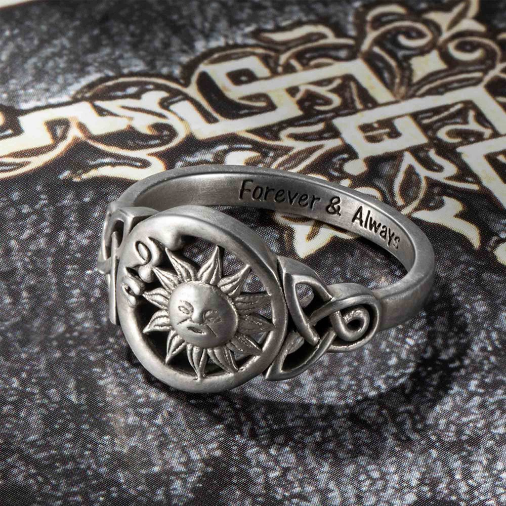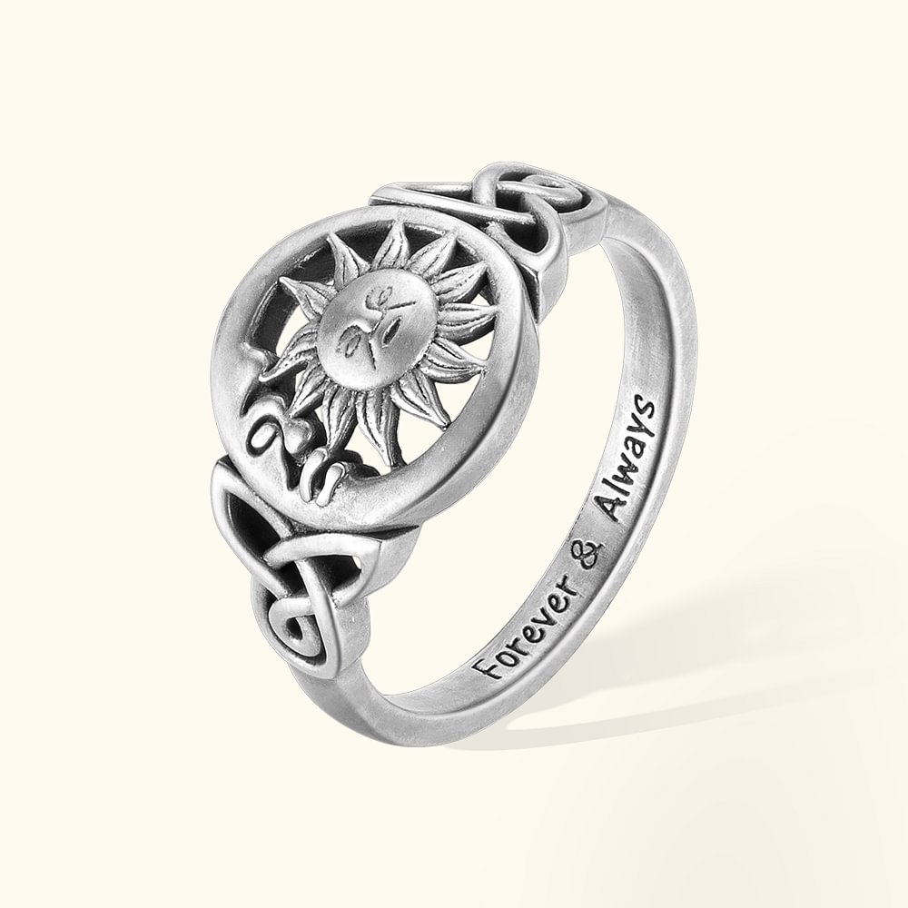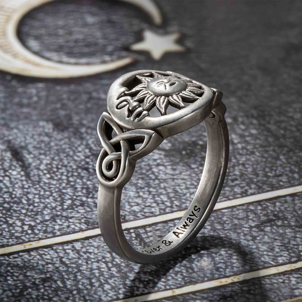 Keltische Knoten sind eine unverwechselbare irische Tradition und symbolisieren Glück, Freundschaft und Stärke. Die Sonne und der Mond auf dem Ring symbolisieren die reine, ewige Liebe, so ewig wie die Sonne und der Mond. Der innere Ring kann mit einem individuellen Schriftzug versehen werden, um alle Ihre Wünsche zu erfüllen! (HOHE QUALITÄT): Hergestellt aus Sterlingsilber, Qualitätssicherung, feine Verarbeitung, klare Beschriftung und angenehmes Handgefühl.
