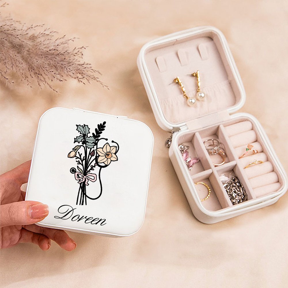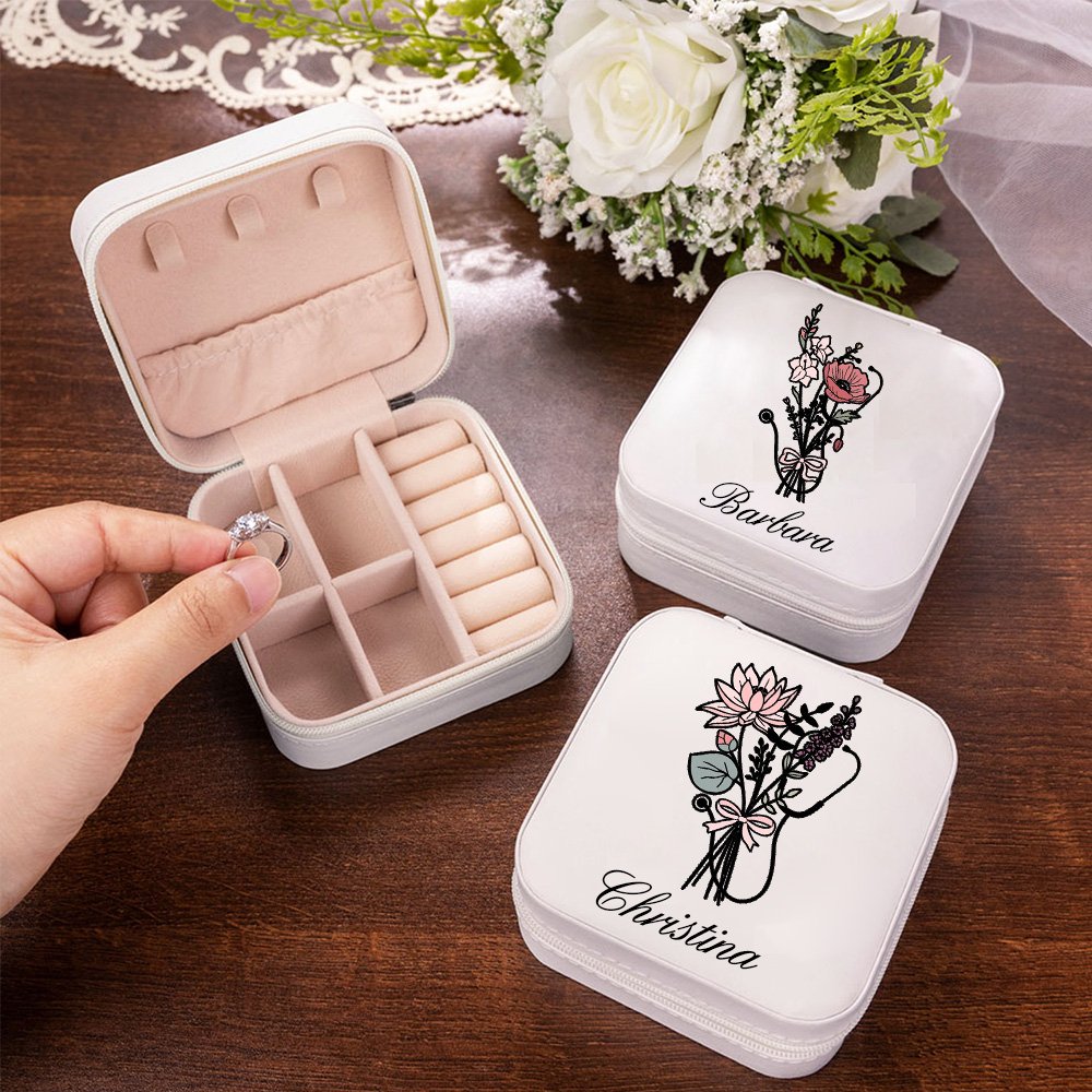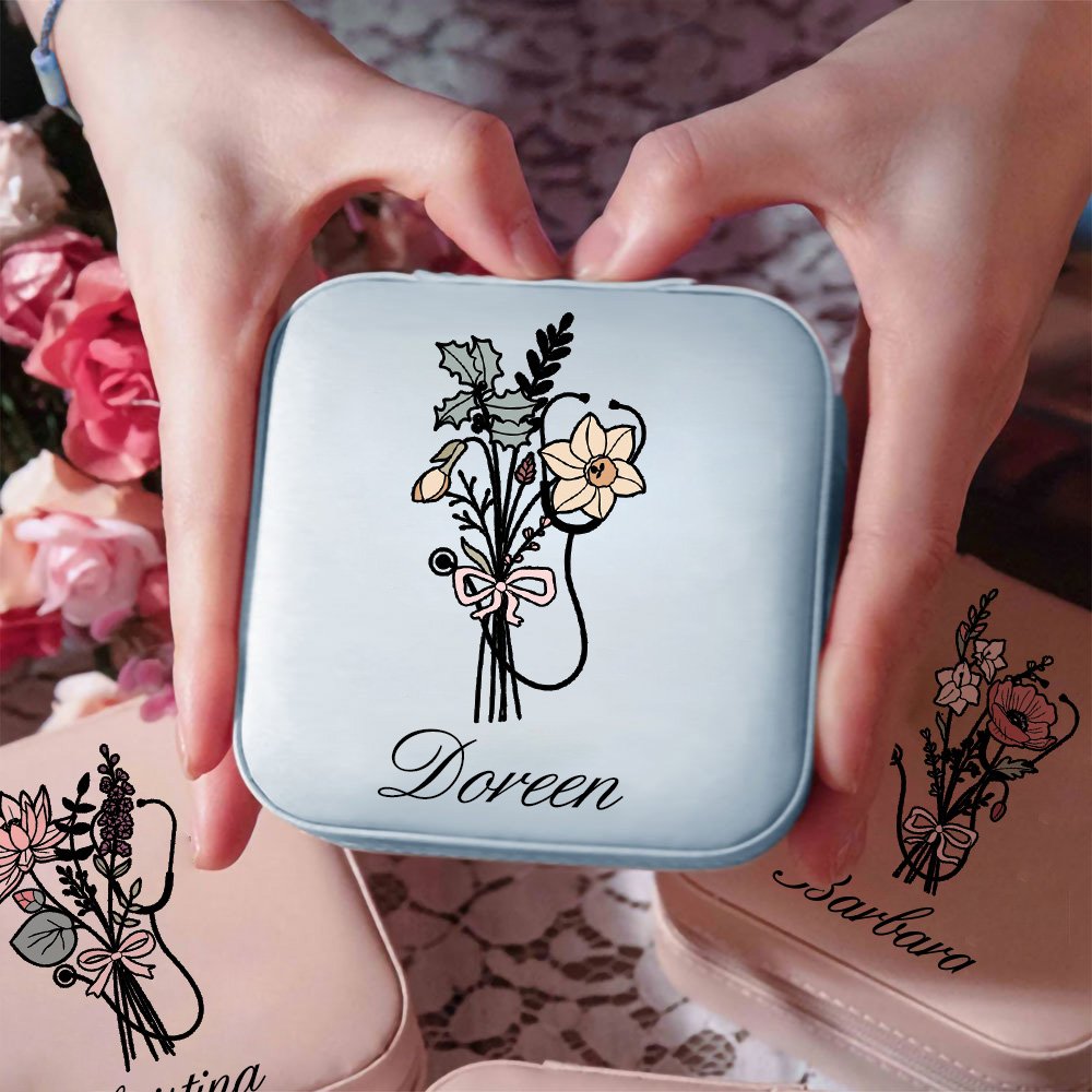 Diese personalisierte Schmuckschatulle kombiniert Elemente von Geburtsblumen und einem Stethoskop, das für die Medizin entwickelt wurde, zu einem atemberaubenden Design, das an einen Blumenstrauß erinnert. Das Schmuckkästchen kann mit dem Namen des Empfängers personalisiert werden, um es zu einem wirklich einzigartigen Geschenk zu machen.