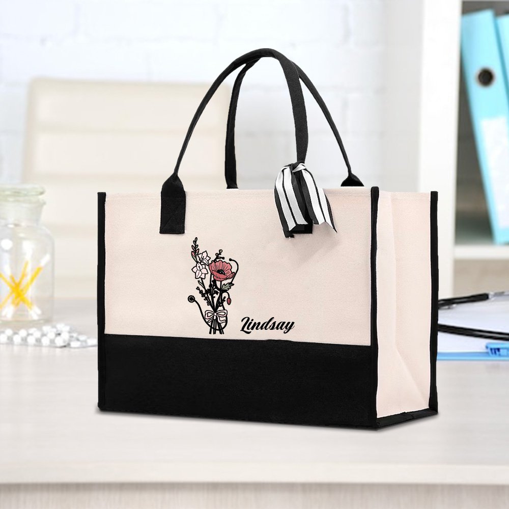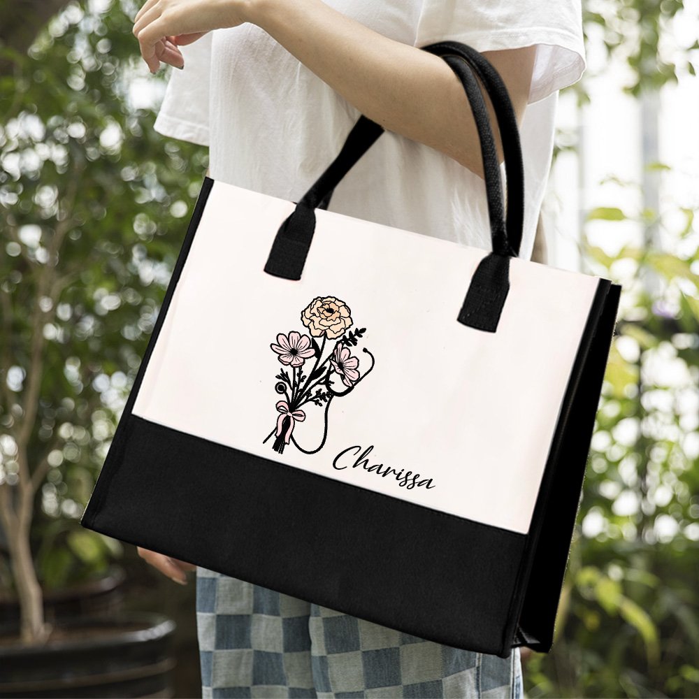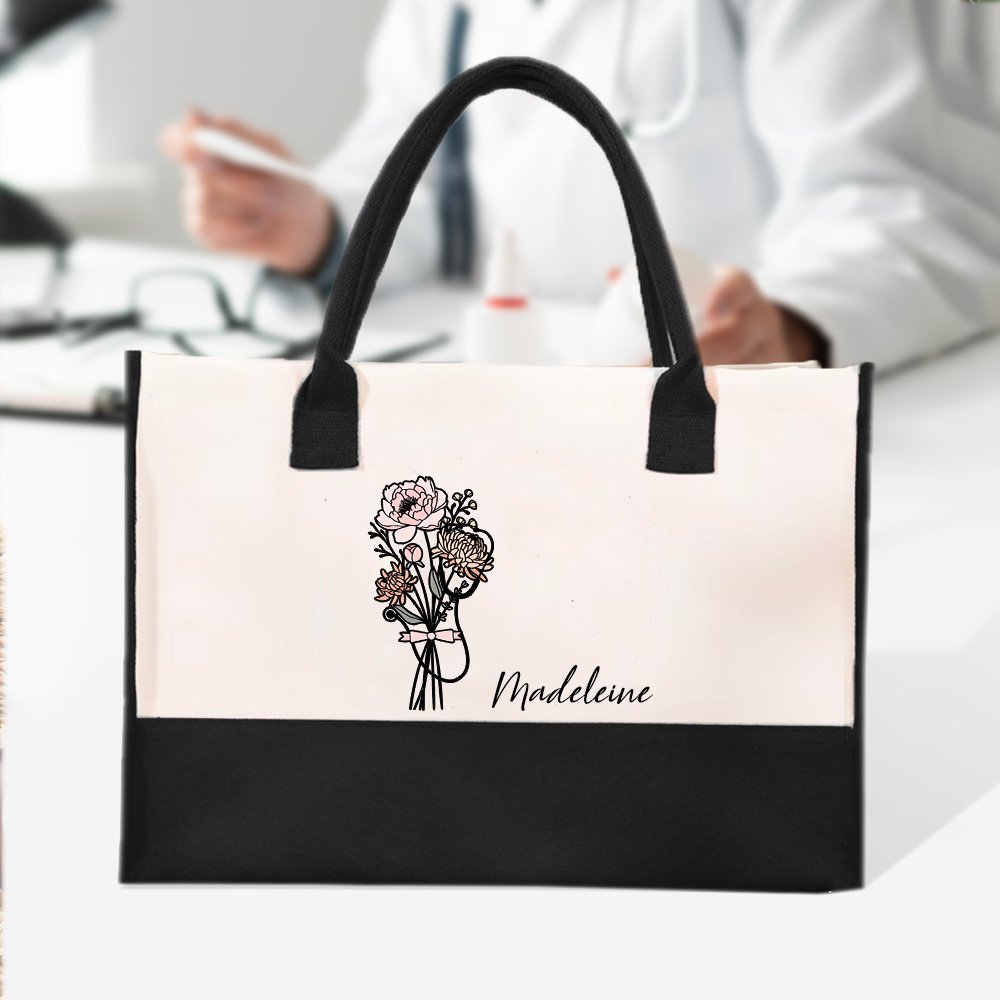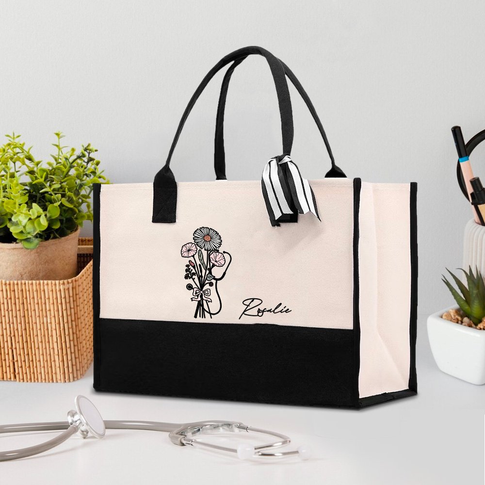 Die Tragetasche ist ein wahres Kunstwerk, das die ikonischen Symbole des medizinischen Berufs mit einem atemberaubenden Blumenmotiv verbindet. Das Herzstück des Designs ist ein detailliertes Stethoskop in schlichtem Schwarz, das die Aufmerksamkeit auf sich zieht. Um das Stethoskop ranken sich zarte, geschwungene Geburtsblumen in einer lebhaften Farbpalette, die eine fesselnde und harmonische Komposition ergeben.