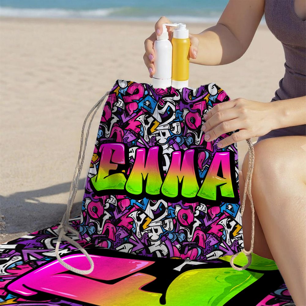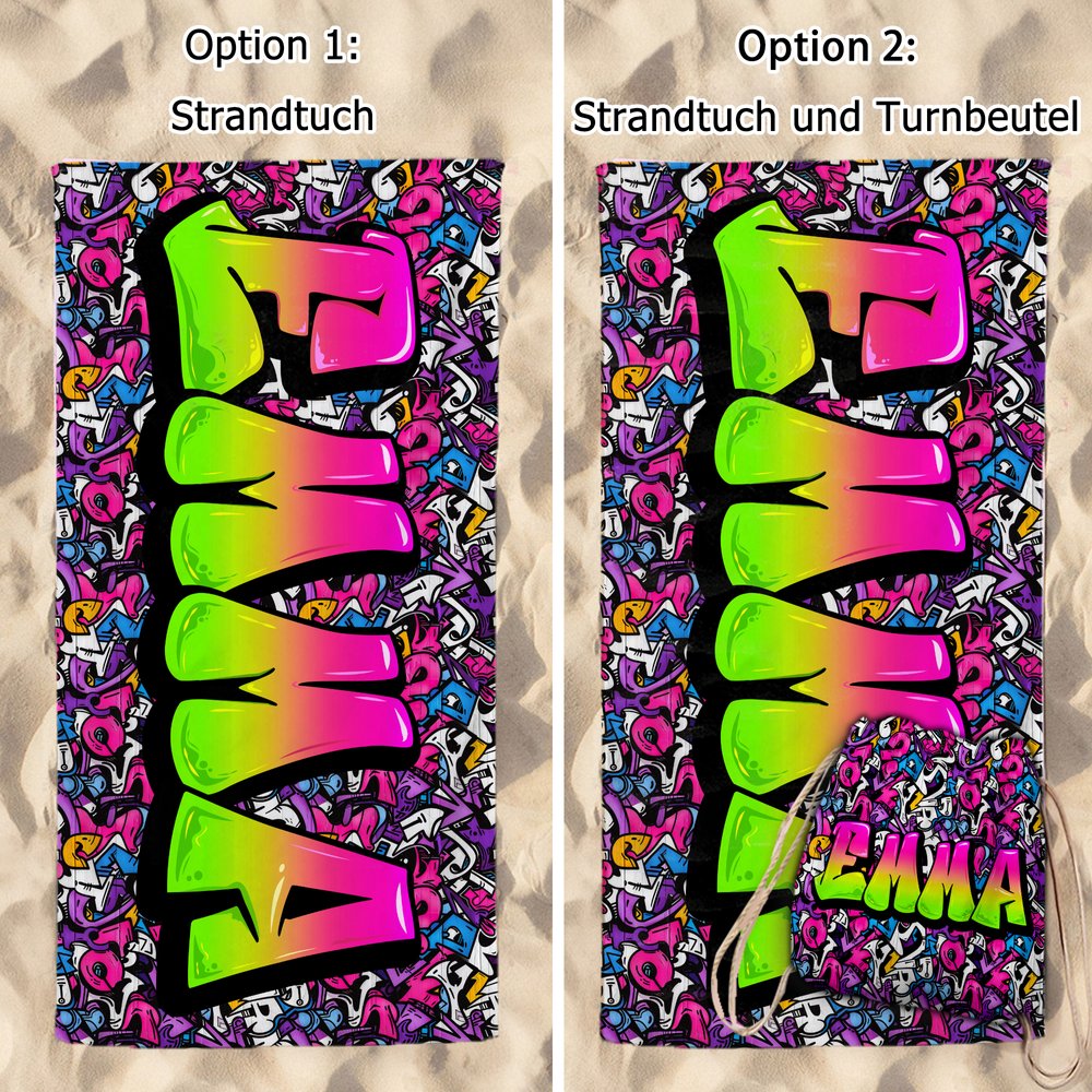 Wählen Sie aus 21 Graffiti-Hintergründen und fügen Sie einen Namen hinzu – kombiniert mit coolen Farbverläufen für den Schriftzug. So verleihen Sie Sommerausflügen einen künstlerischen und trendigen Touch. Das Strandtuch ist in zwei Größen – klein und groß – erhältlich, eignet sich für Kinder, Jugendliche und Erwachsene und sorgt für zusätzlichen Komfort am Strand oder Pool.