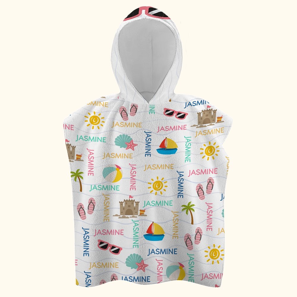 Die einzigartige Kombination von Elementen wie Sonne, Muscheln, Schlösser, Sonnenbrillen, Segelboote, etc., fügt Kindlichkeit zum Meer und macht die Urlaubsstimmung entspannter und angenehmer. Personalisieren Sie den Namen, um ein einzigartiges Strandtuch zu kreieren, das einen einzigartigen Stil zeigt und ein wirklich einzigartiges Souvenir ist.