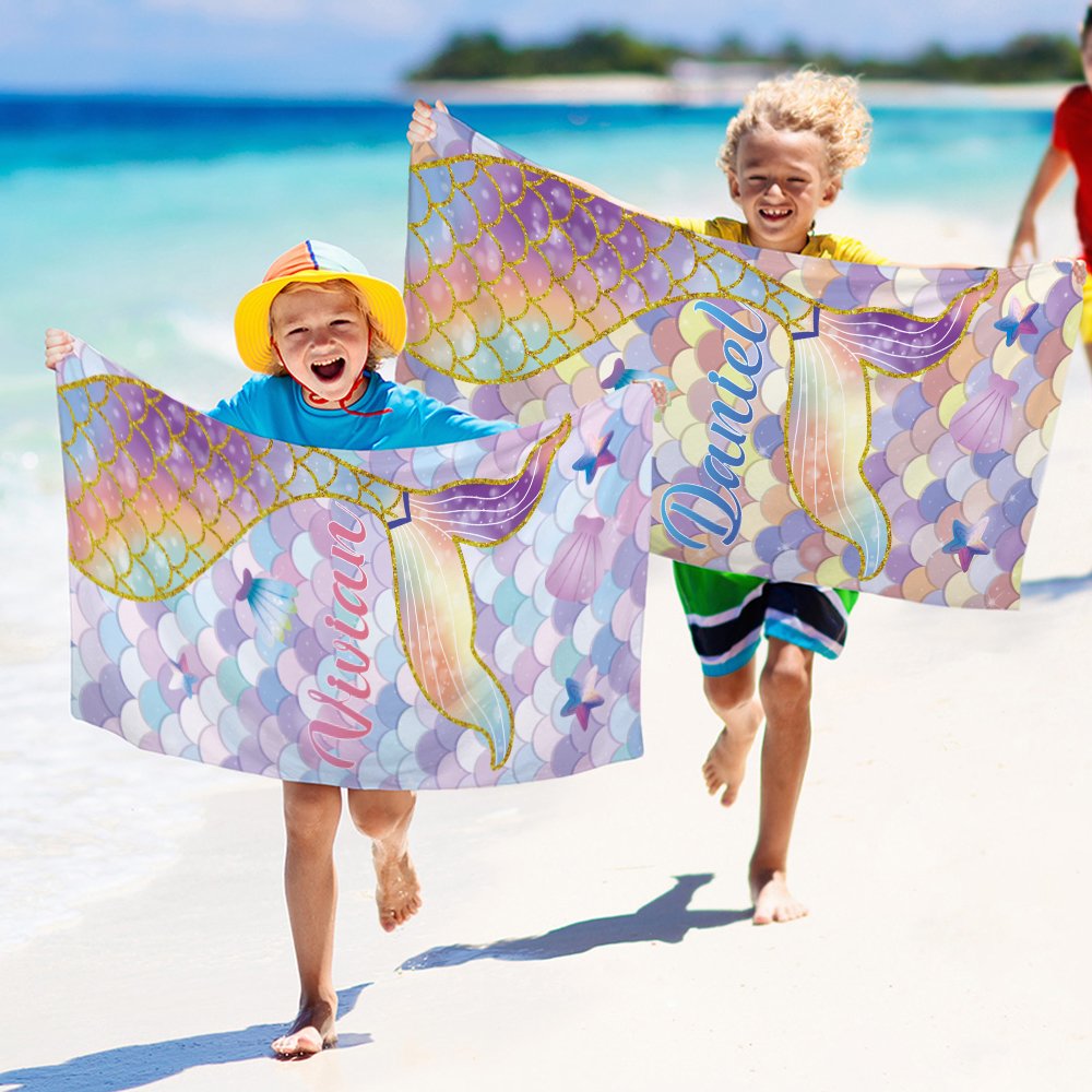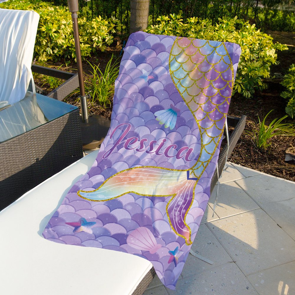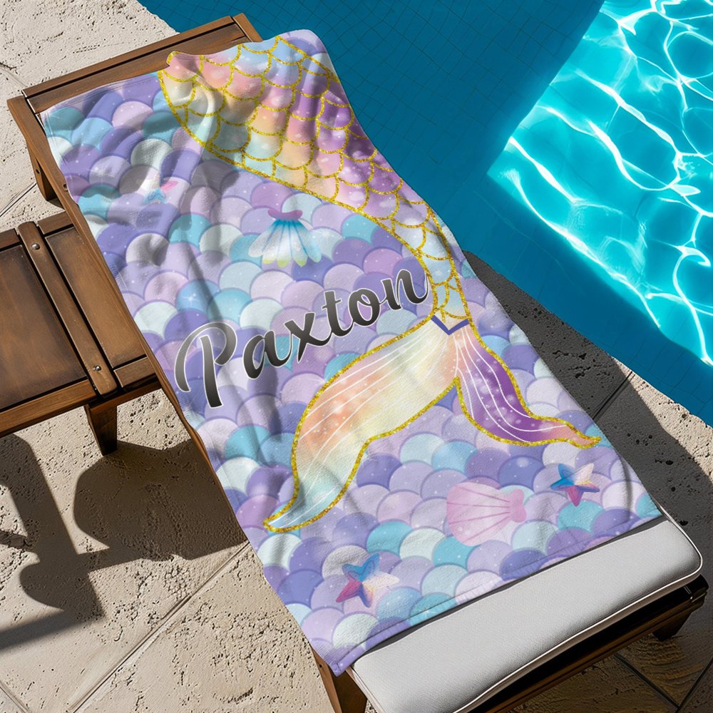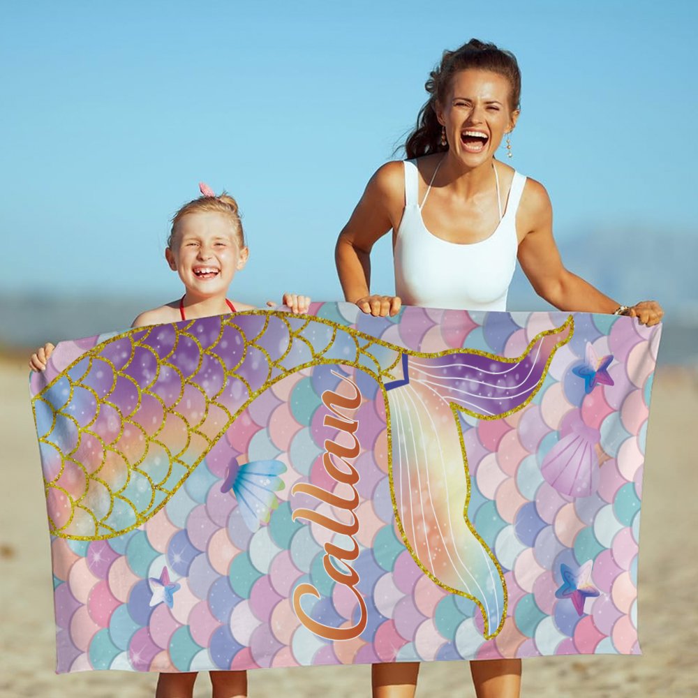 Bunte Schuppen und naturgetreue Fischschwänze, das Meerjungfrauenmuster verleiht dem Strandtuch einen Hauch von Sommer und verträumten Farben, und jeder Strich und jedes Detail ist sorgfältig gestaltet. Dank der Personalisierungsoptionen können Sie das Handtuch mit Ihrem Namen versehen, was es zu einem noch einzigartigeren und besonderen Geschenk macht.