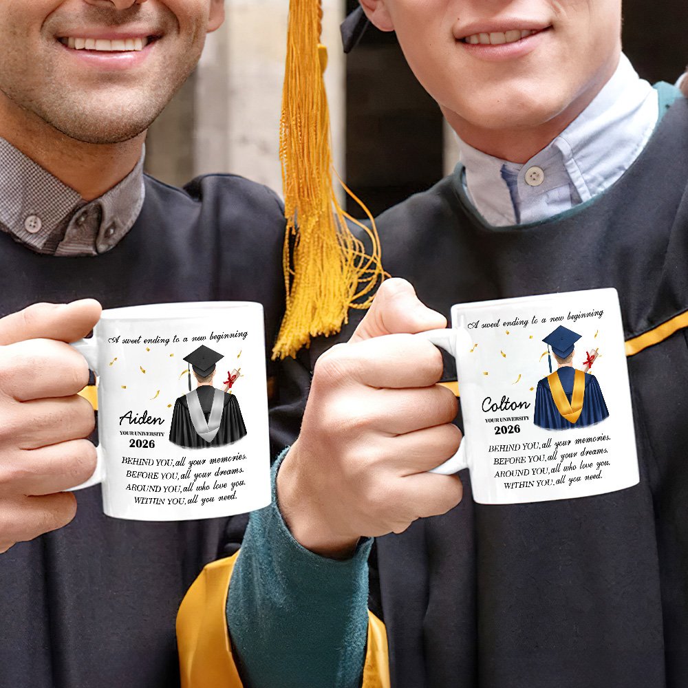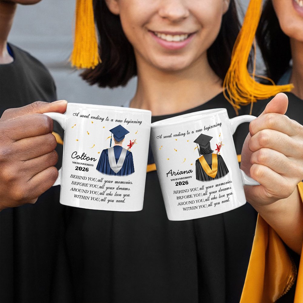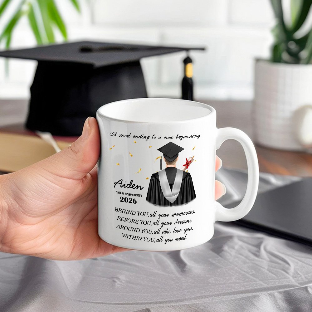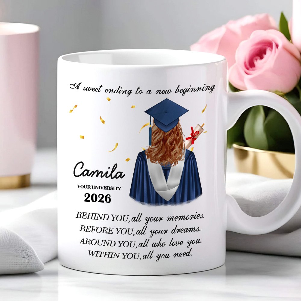 Diese Keramiktasse kombiniert personalisierte Elemente mit einer niedlichen Absolventenfigur. Das inspirierende Wort "Ein süßes Ende zu einem neuen Anfang" auf der Oberfläche gedruckt ist die besten Wünsche für jeden Absolventen. Sie können auch Ihren Namen, das Abschlussjahr und den Namen der Schule angeben, um dieser Tasse eine einzigartige Note zu verleihen.