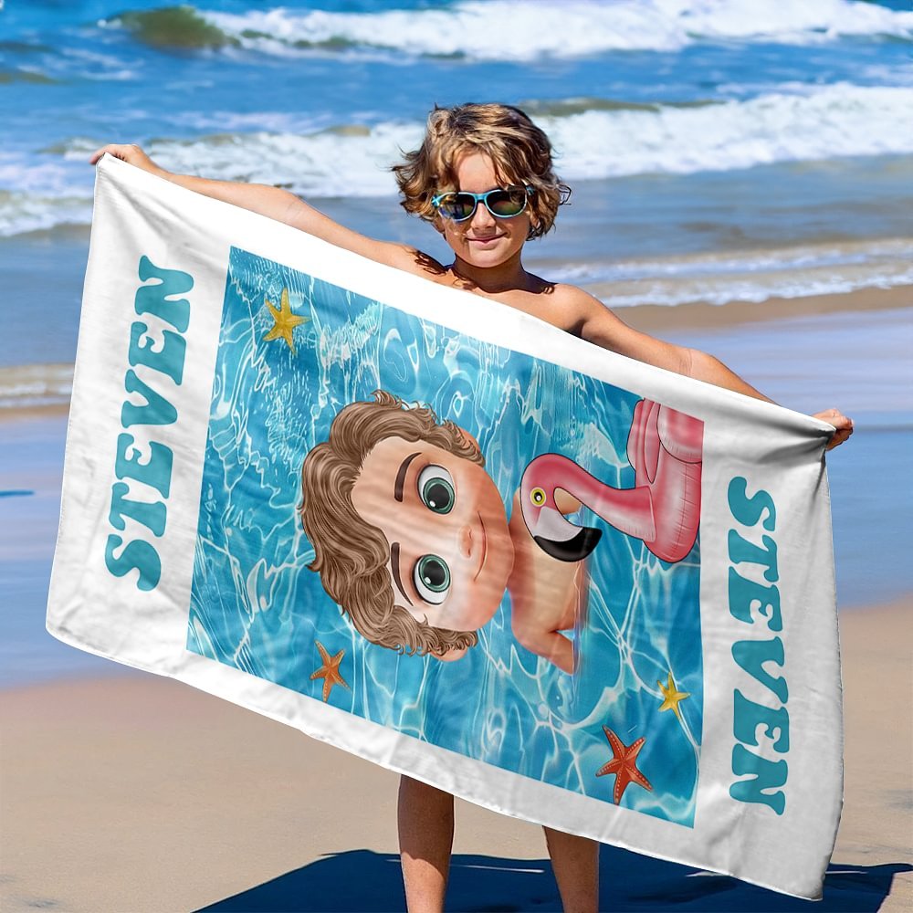 Das Design des 3D-Cartoon-Musters des Strandtuchs ist voller Kindlichkeit und Freude und bringt unendlich viel Spaß und persönlichen Charme in die sommerlichen Wasseraktivitäten. Sie können verschiedene Geschlechter und Schwimmringe nach Ihren Vorlieben auswählen und auch den exklusiven Namen Ihres Kindes aufdrucken lassen, um ein unverzichtbares Strandaccessoire für Kinder zu schaffen.