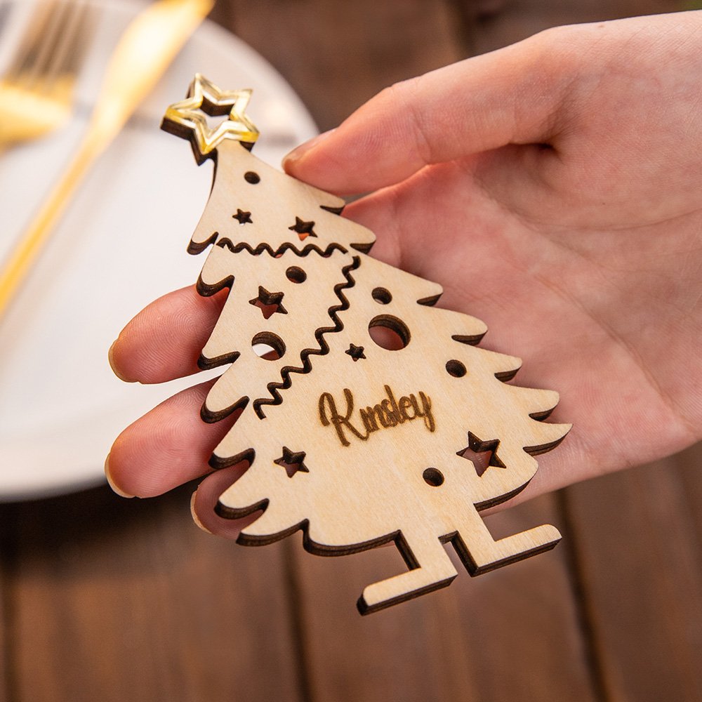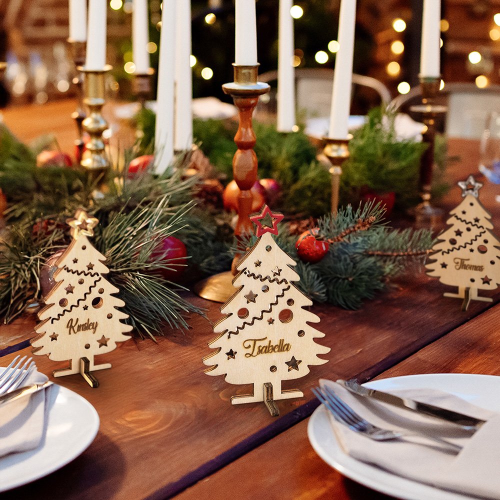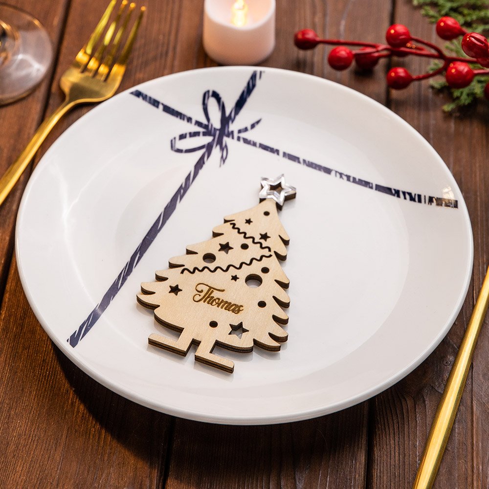 Diese Platznamen eignen sich nicht nur für den gedeckten Tisch, sondern können auch an den Weihnachtsbaum Ihrer Familie gehängt werden. Wenn Sie sie als Ornamente anbringen, wird die festliche Atmosphäre Ihres Raumes noch verstärkt. Diese vielseitige Holzdekoration wird in der Weihnachtszeit sicher von Kindern und Erwachsenen gleichermaßen geliebt werden.