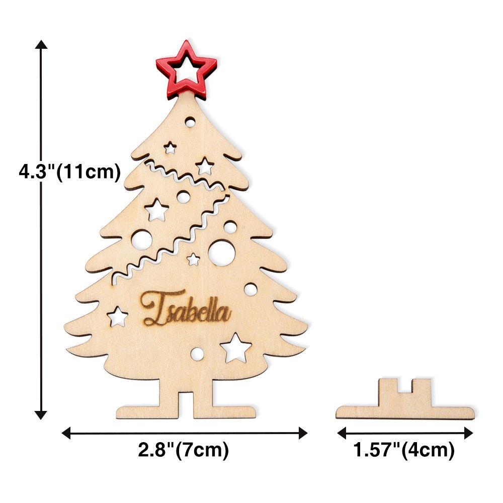 Die personalisierten weihnachtlichen Tischnamen sind eine klassische Ergänzung zu Ihrer Weihnachtsdekoration. Sie haben die Form eines Weihnachtsbaums und sind mit einem glänzenden fünfeckigen Stern an der Spitze versehen, der dem Familientisch einen Hauch von Glanz verleiht. Dank der 3D-Aufstellbarkeit können sie auf jeder Platte, jedem Tisch, Kamin, Tresen usw. aufgestellt werden und schaffen eine warme und festliche Atmosphäre, die Ihre Familie und Freunde begeistern wird.