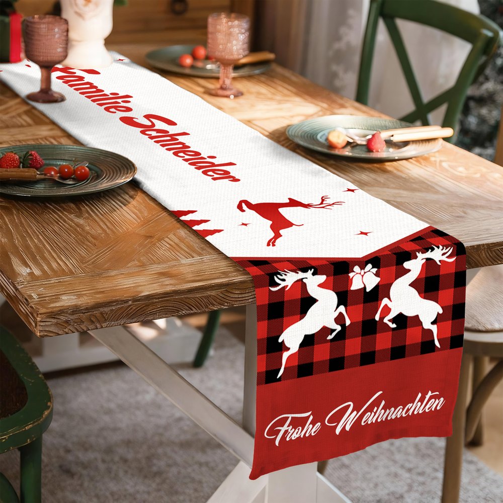 Mit klassischen Weihnachtssymbolen wie Weihnachtsmann, Rentier und Schneeflocken taucht dieses Tischset Ihr Zuhause in eine festliche Atmosphäre. Tischläufer und Platzsets können mit Ihrem Familiennamen, einzelnen Namen oder weihnachtlichen Grüßen personalisiert werden – so wird jedes Familienessen oder Treffen mit Freunden zu einem einzigartig bedeutungsvollen Weihnachtsmoment.