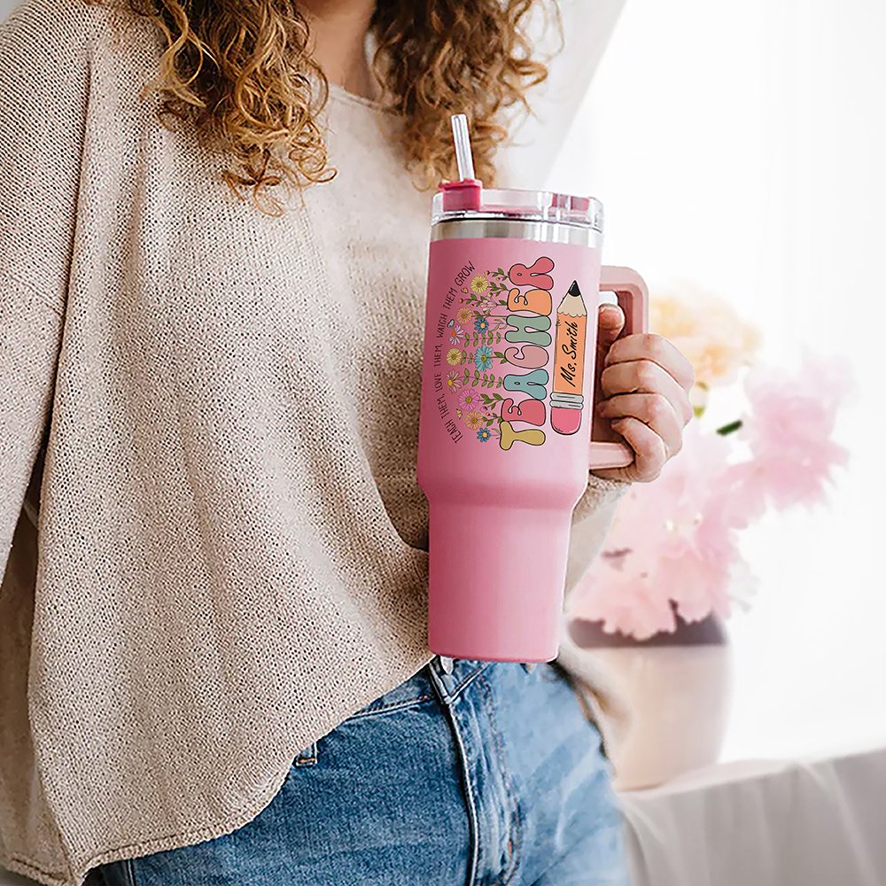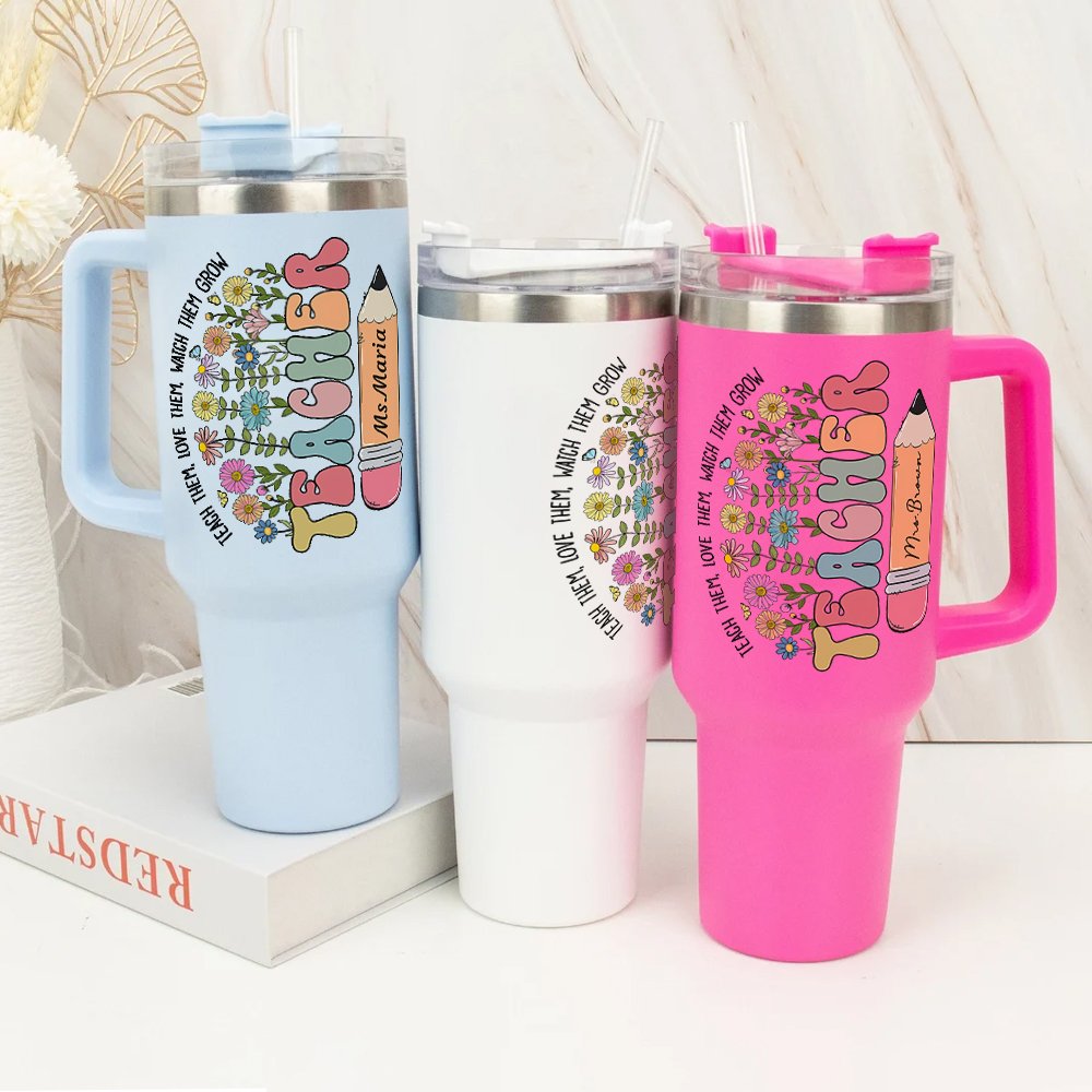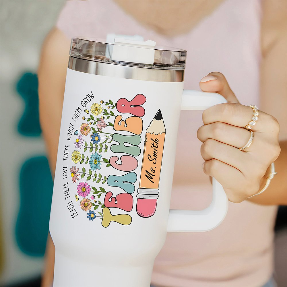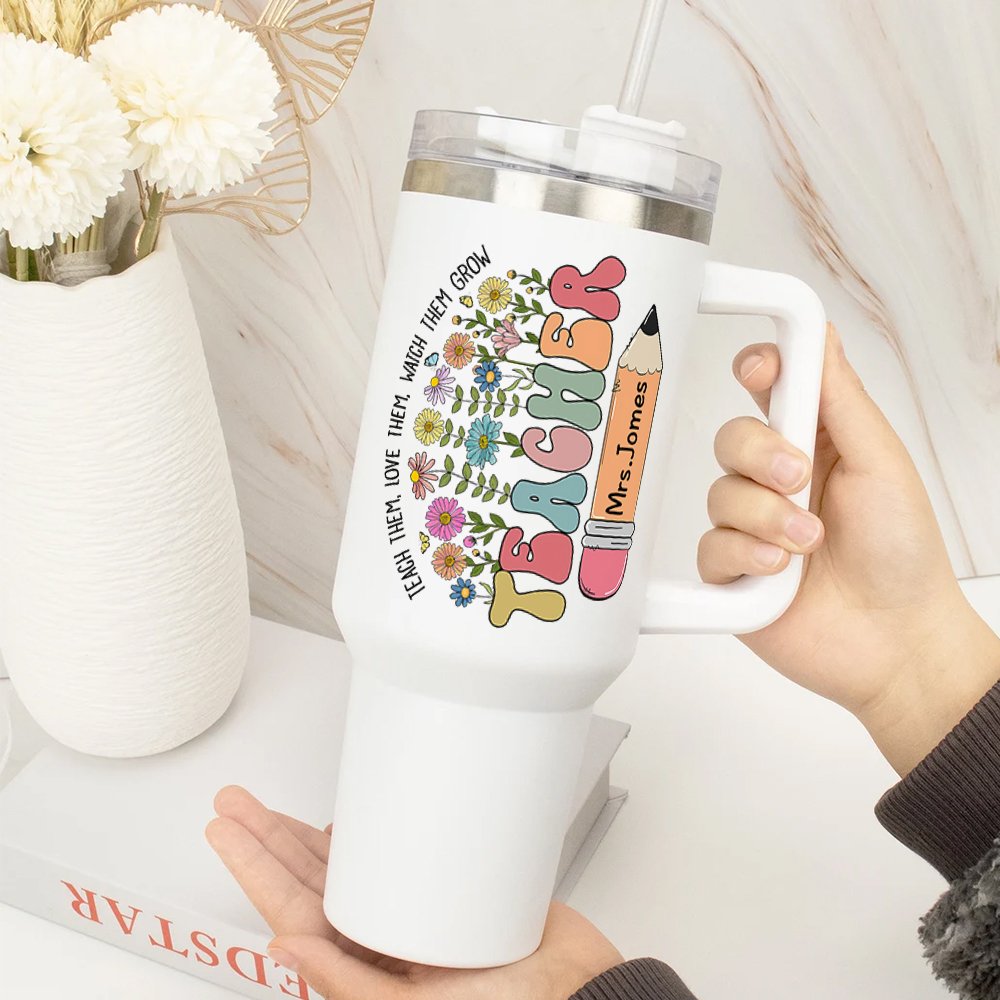 Auf dem Becher steht die herzliche Botschaft "TEACH THEM LOVE THEM WATCH THEM GROW". Das schöne Blumen- und Bleistiftdesign feiert die Größe der Lehrer und symbolisiert, wie Kinder unter der Obhut ihrer engagierten Lehrer aufblühen.