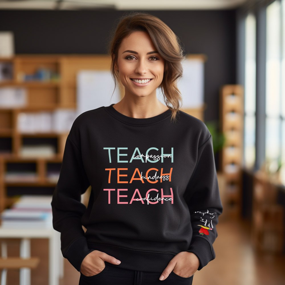 Das Kleidungsstück ist mit einer lustigen Lehrergrafik und positiven Worten des Mitgefühls, der Freundlichkeit und des Vertrauens bedruckt. Diese bequemen und inspirierenden Lehreroberteile sind perfekt, um Schüler zu motivieren und ein positives Klassenklima zu fördern.