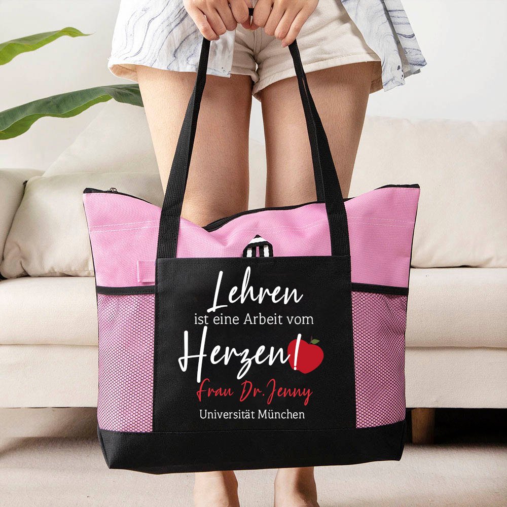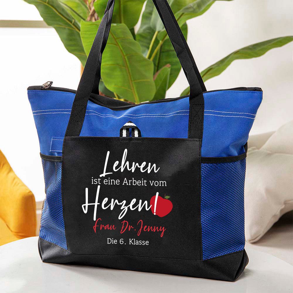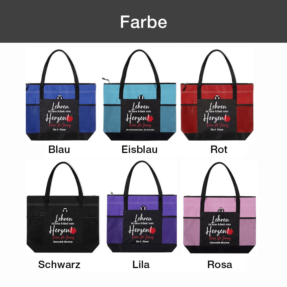 Das Besondere an dieser Tasche ist die Möglichkeit, sie mit dem Namen des Lehrers oder der Lehrerin und einer Ihrer speziellen Botschaften zu personalisieren. Mit dieser persönlichen Note zeigen Sie dem Lehrer, dass Sie sich die Zeit genommen haben, ein Geschenk speziell für ihn auszuwählen. Es ist eine kleine Geste, die Ihre Bewunderung und Wertschätzung für ihr Engagement in der Bildung zum Ausdruck bringt.