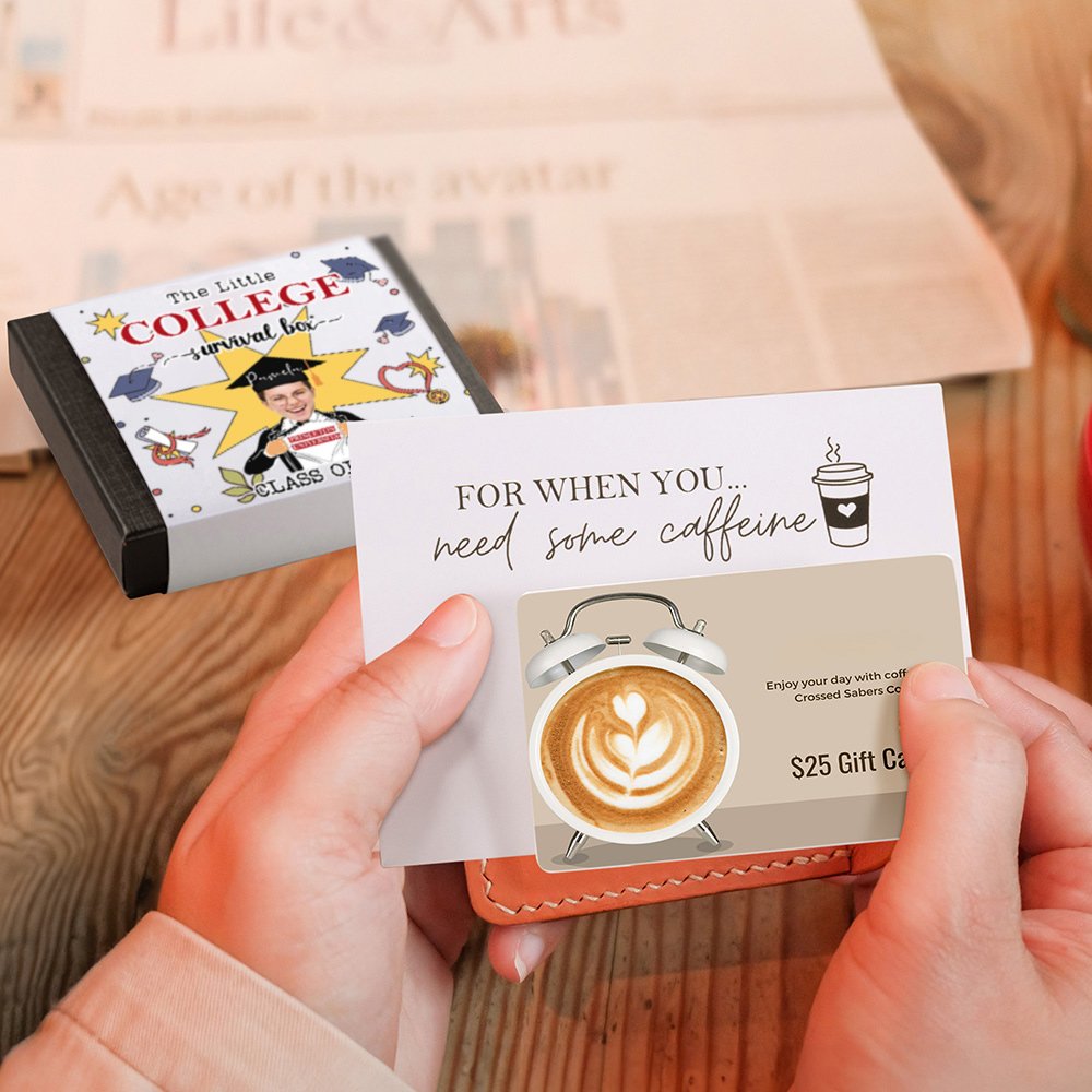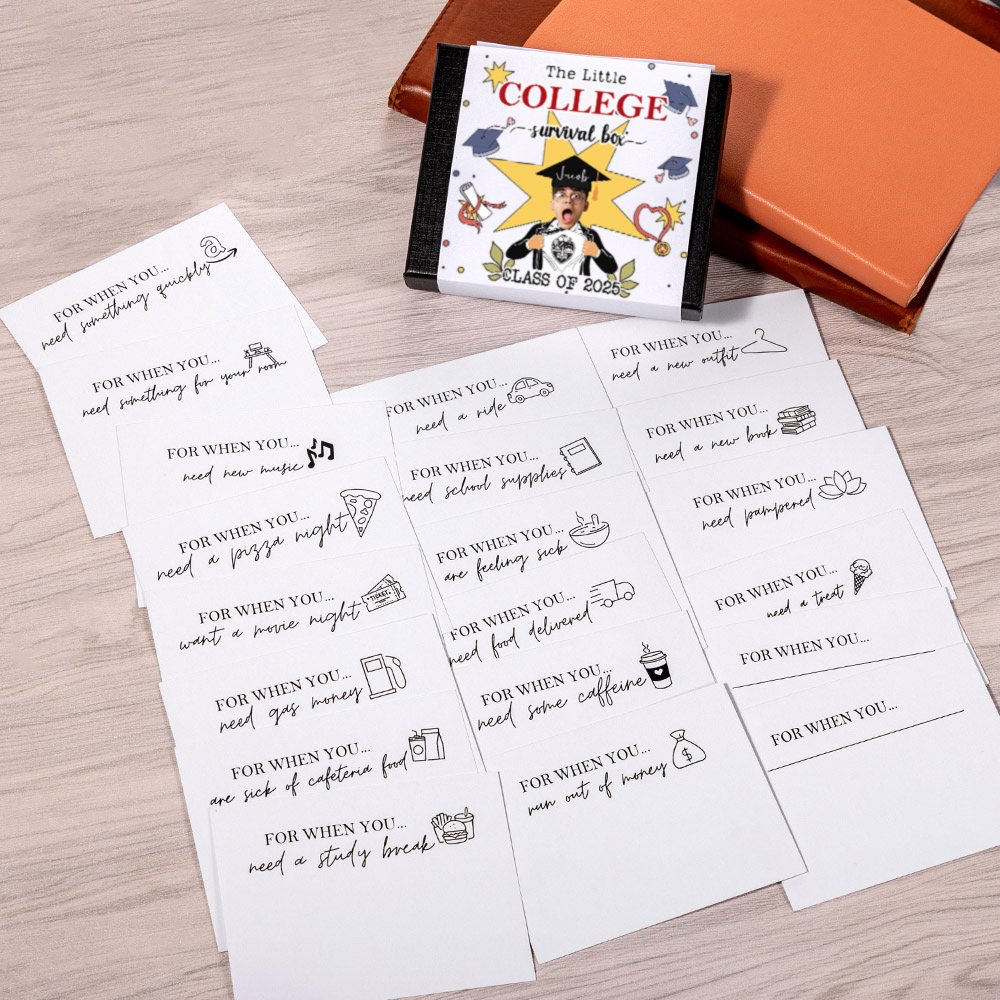 Diese personalisierte Survival-Box bringt eine zusätzliche Schicht von Spaß und Personalisierung, einschließlich der benutzerdefinierten Gesicht Fotos, Schulname oder Logo, Abschlussjahr, und Erstsemester Namen, die Schaffung eines wirklich einzigartig und unvergesslich College Care-Paket für die High-School-Absolventen. Die verspielte, feierliche Stimmung der Box spiegelt die Aufregung über den Abschluss und den Weg zum College wider.