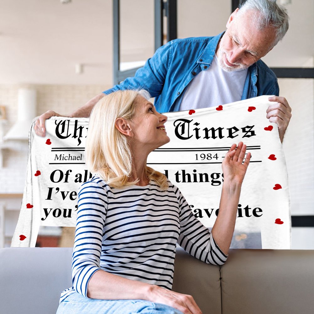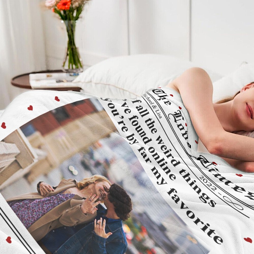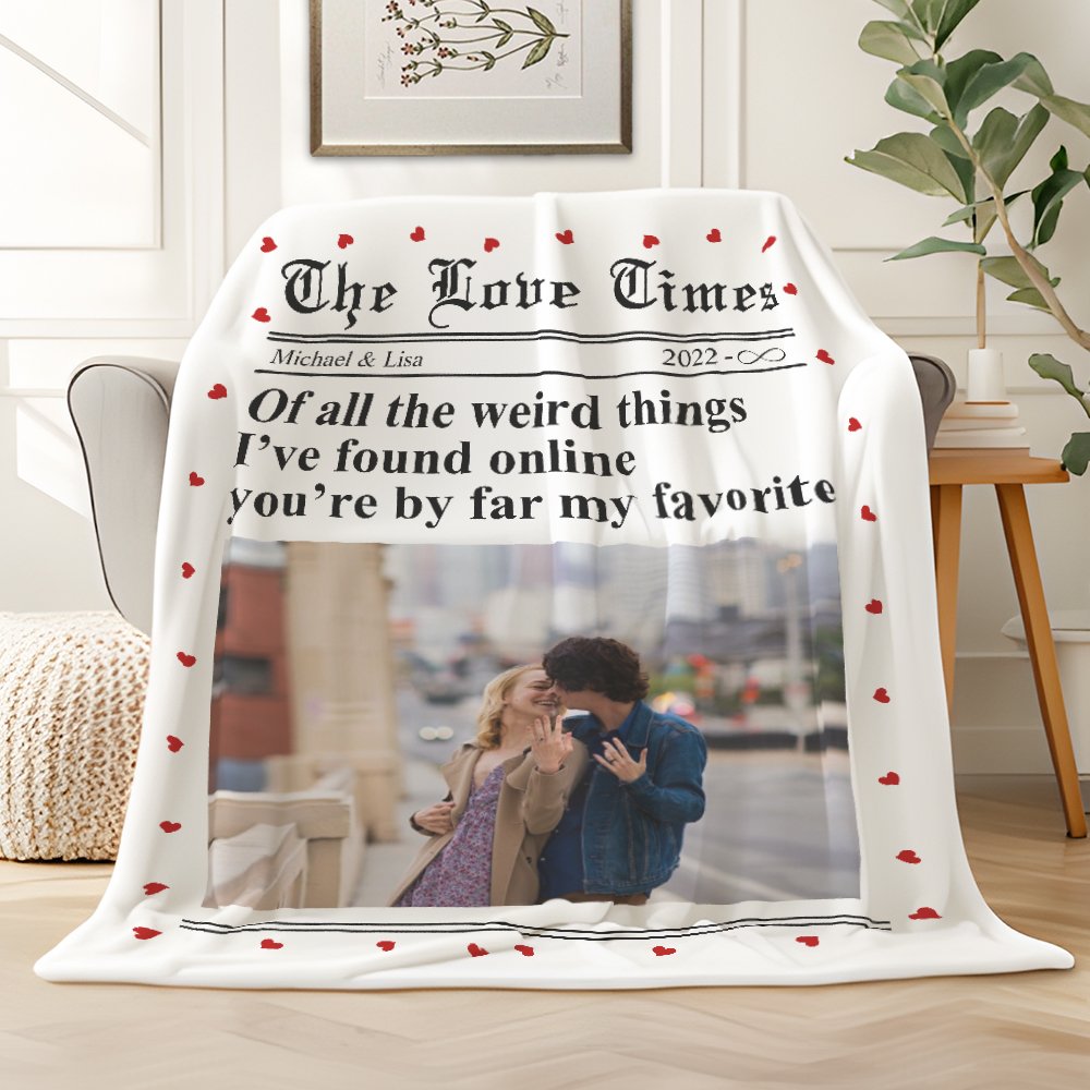 Diese Decke wurde von der New York Times entworfen, und der Herzrand sorgt für eine süße Atmosphäre, indem er die guten Nachrichten über dich und deinen Partner verkündet. Du kannst den Titel, den Namen und das Jahr darauf anpassen und deine Fotos hochladen, mit dem Text "Von all den verrückten Dingen, die ich online gefunden habe, bist du bei weitem mein Liebling", was romantischer und fröhlicher ist.
